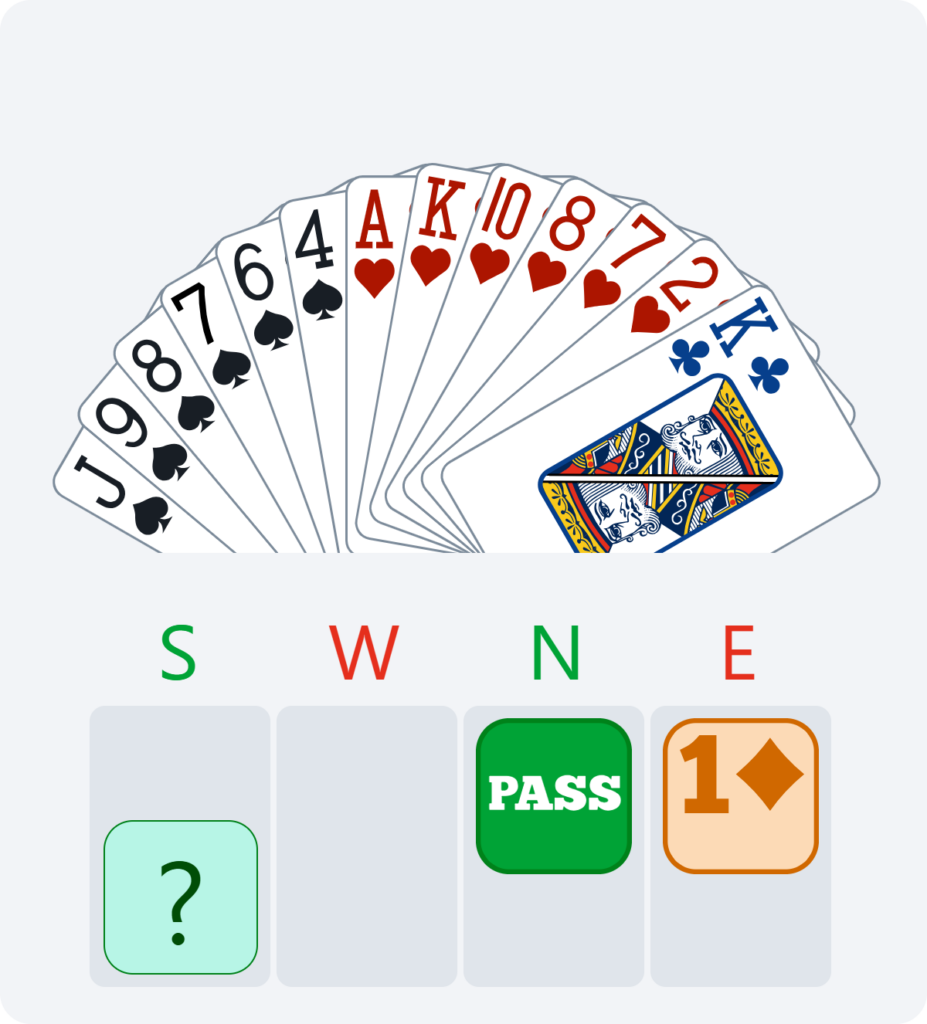 Some would open 1♦, others 1♥… I am not sure that I would do the same thing every time myself! With five such lovely hearts, I decided to open my five-card major this time. A good decision on this deal, as my left-hand opponent overcalled 2♦!