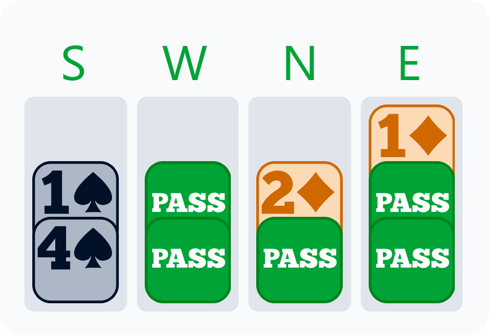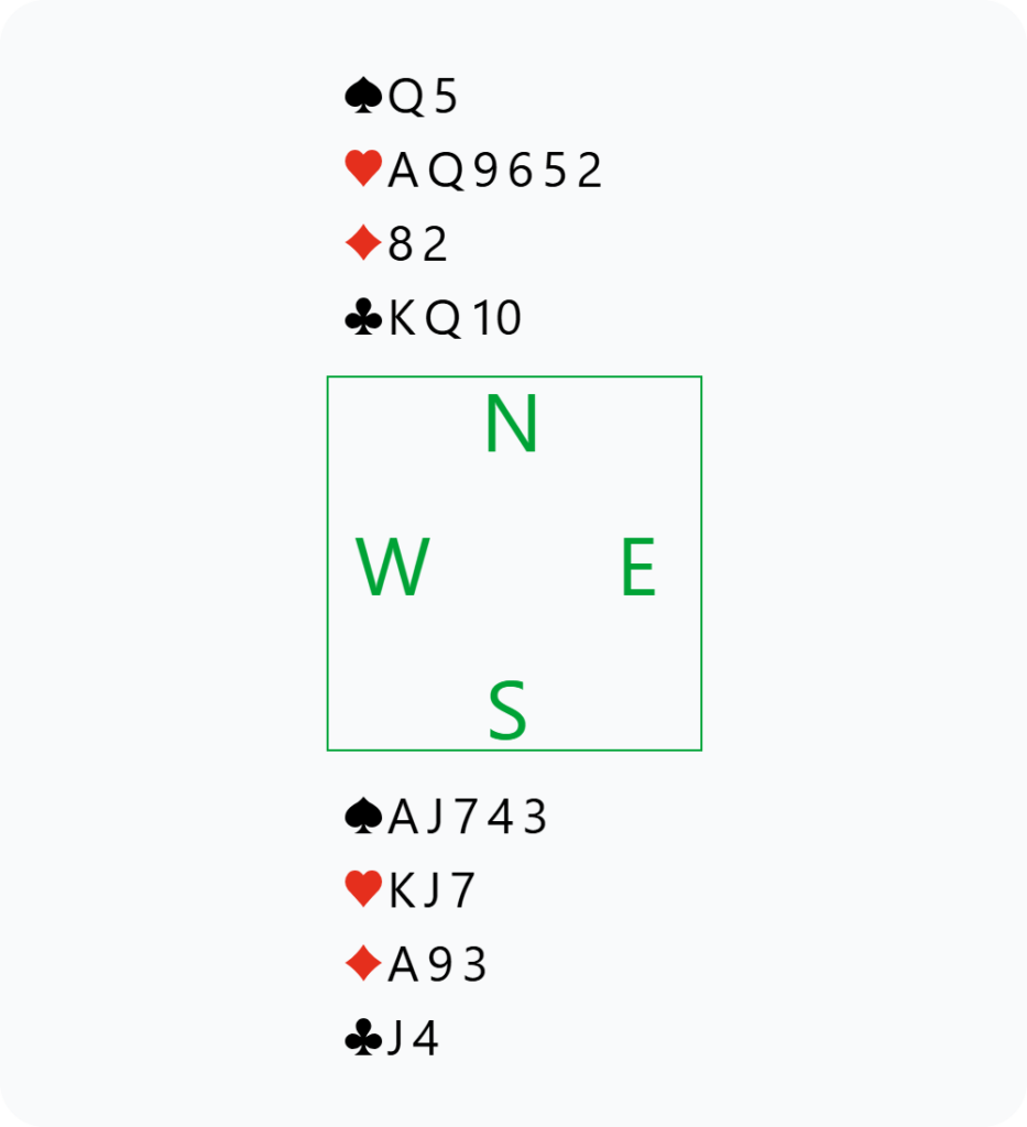 An unexpected mishap: our two young friends missed their nine-card Heart fit and went down in 4♠, unable to avoid losing two trump tricks when the suit broke 4–2.