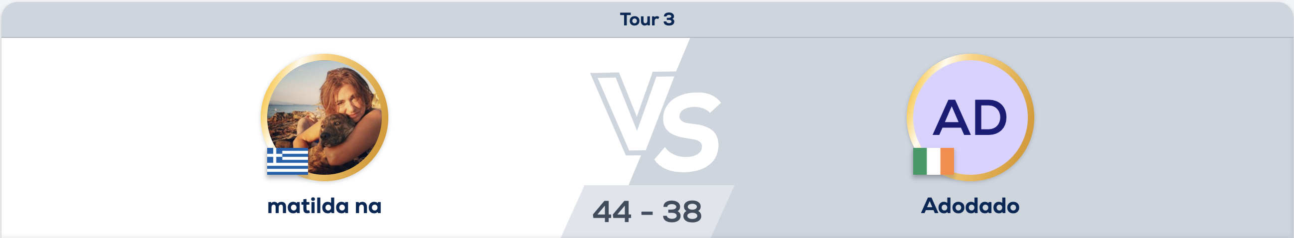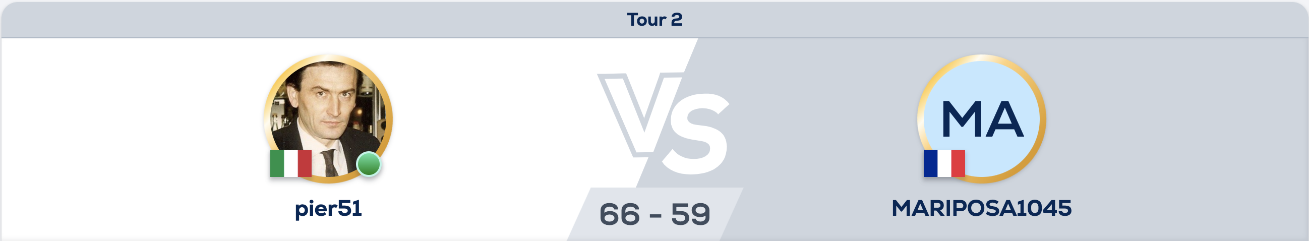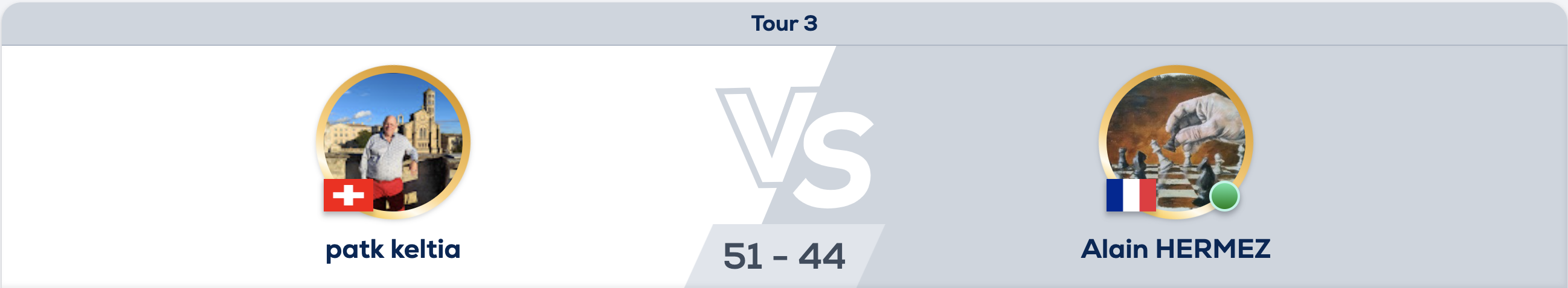 It is fair to say that Patk keltia, a League 11 competitor with an average performance of 44%, was probably not expected to make waves in this tournament. Yet he sprang an almighty surprise, triumphing 51-44 in a keenly contested match against League 1 player Alain HERMEZ, whose average performance is above 63%. This perfectly encapsulated how this competition draws together players from different levels and can serve up unpredictable twists and turns and memorable exploits.