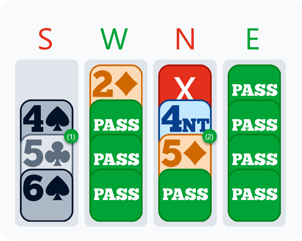 It should be noted that if West had not opened 2♦, East would probably have been able to bid his clubs, and North would then have had to bid 6♠ from his hand to avoid being played through in clubs. Here, paradoxically, the pre-emptive opening made the defence more blind.