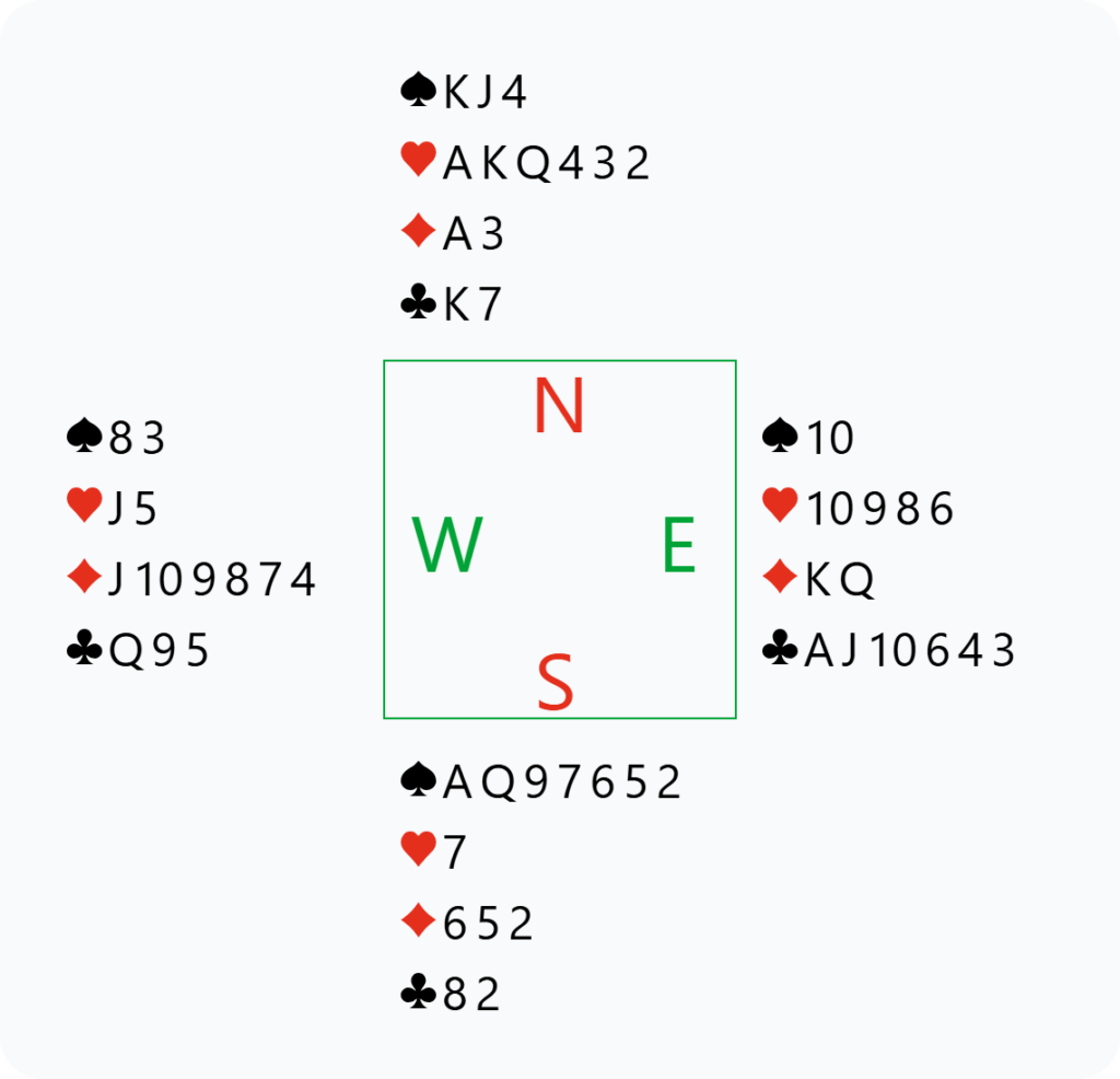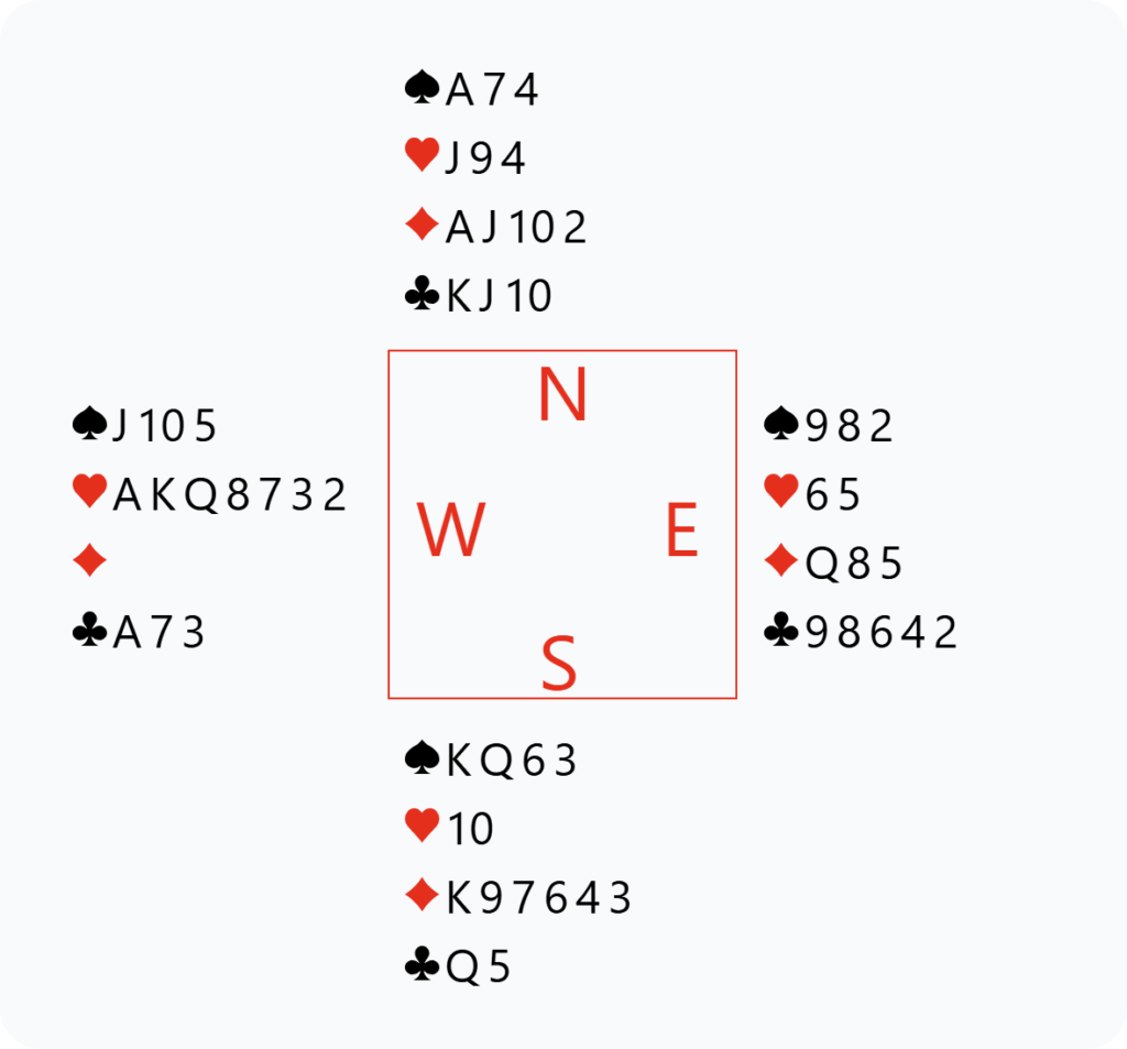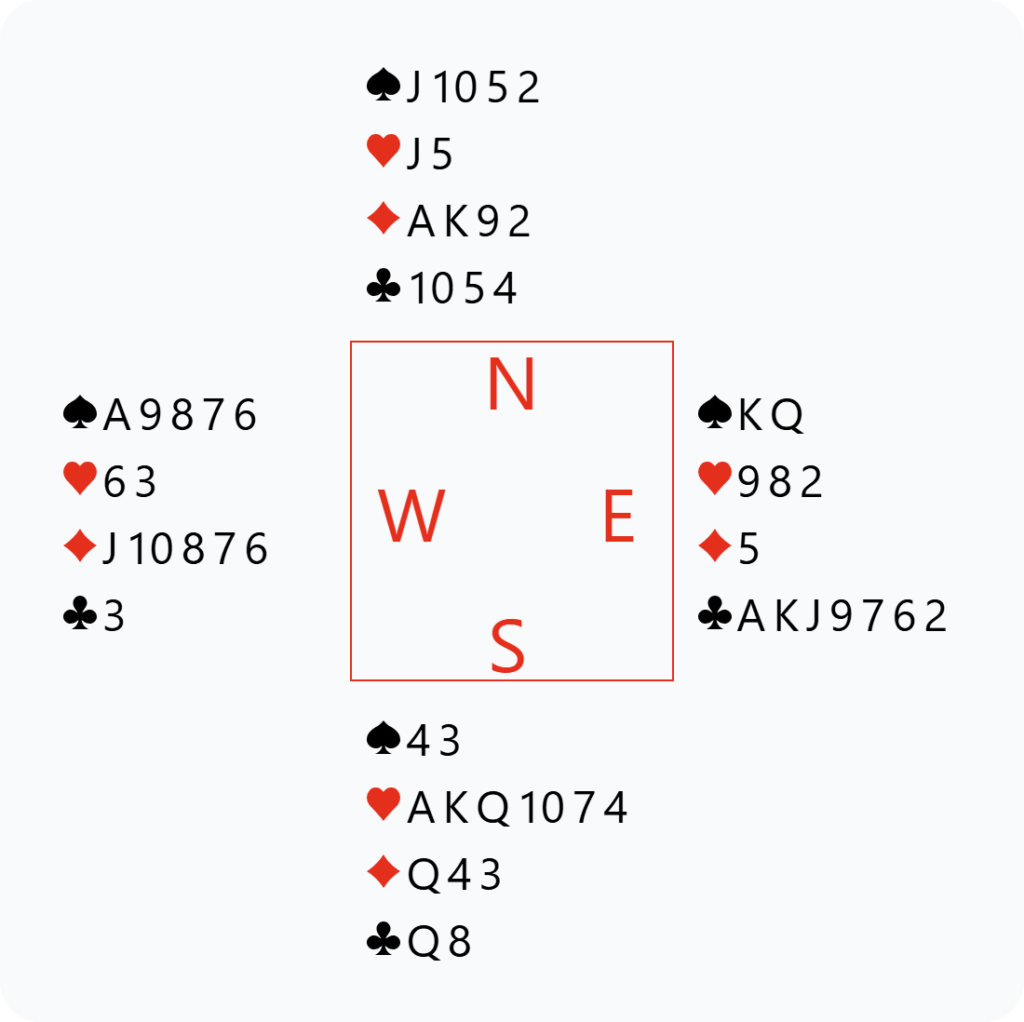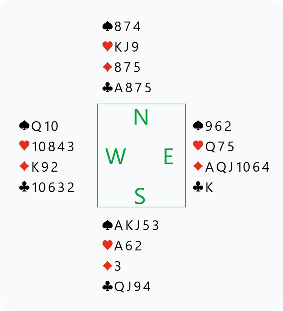 Here’s a second deal, this time from the first half of our third match. We’re now playing against the Dutch. Maëva, my partner in the last championships—with whom I won the European Girls’ Pairs Championships among other things—, is sitting South, while I remain in North.