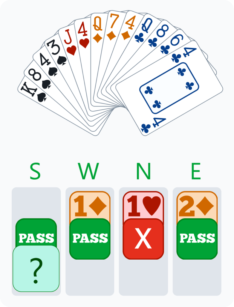 Admittedly, if the contract makes, it is not as dangerous as 2♥ or 2♠ doubled. Nevertheless, you cannot double the opponents at the 2-level when they have a fit and you could be in the minority in terms of points. If, by chance, 2♦ were to go down, then that would mean that you most likely have a game contract to play in that would earn you more. If you had had five good diamonds, for example, you could have passed. Here, you only have four, and they are relatively small.