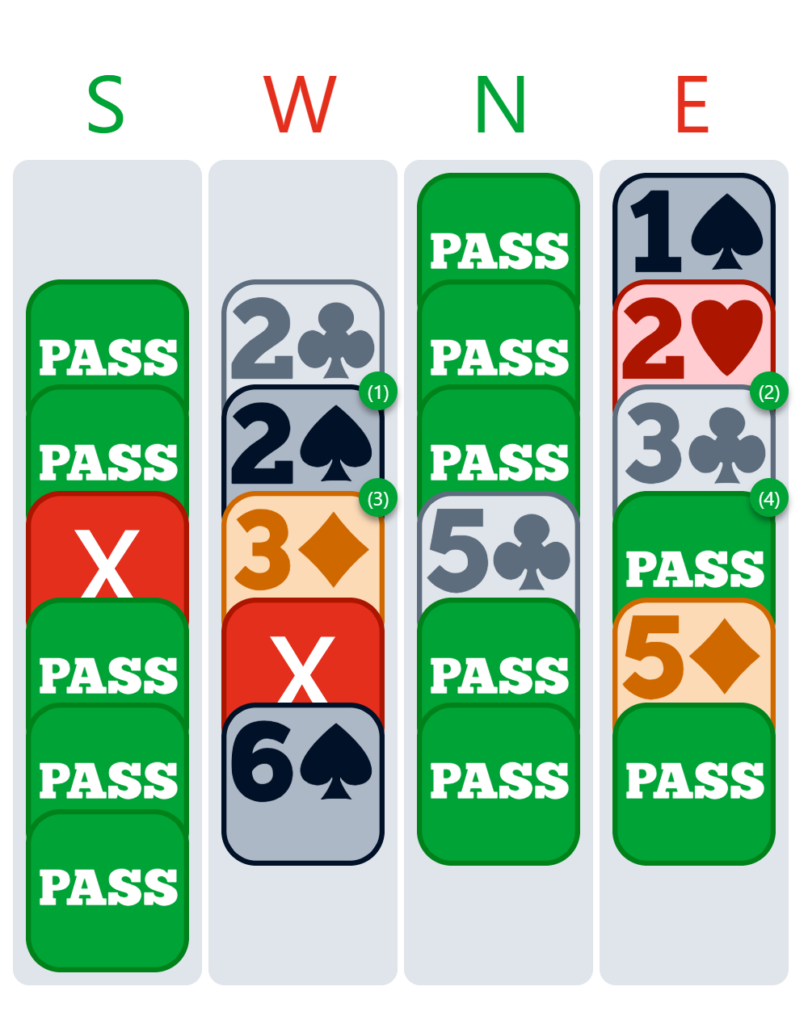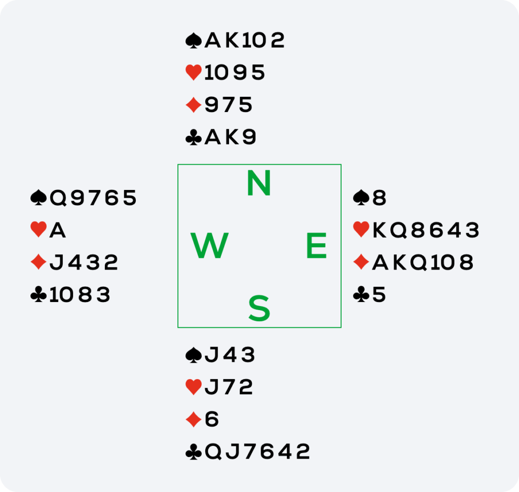 I decided to show the strong 5-5 because I had too few losers for 2♥ and my hearts were too bad to impose them at the 4-level. I wasn’t strong in terms of points, but I took the risk. Federico did say 2♥ as pass or correct over 2♦, I was able to say 3♦, which showed the strong red 5-5. He then made the right decision by bidding 5♦.
