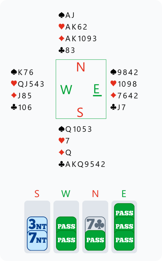 So this time, I decide to fully commit to my “gambling” idea: I bid 7NT! No one doubles, and the decision proves profitable when dummy comes down: thirteen top tricks and a score of 95.5%.