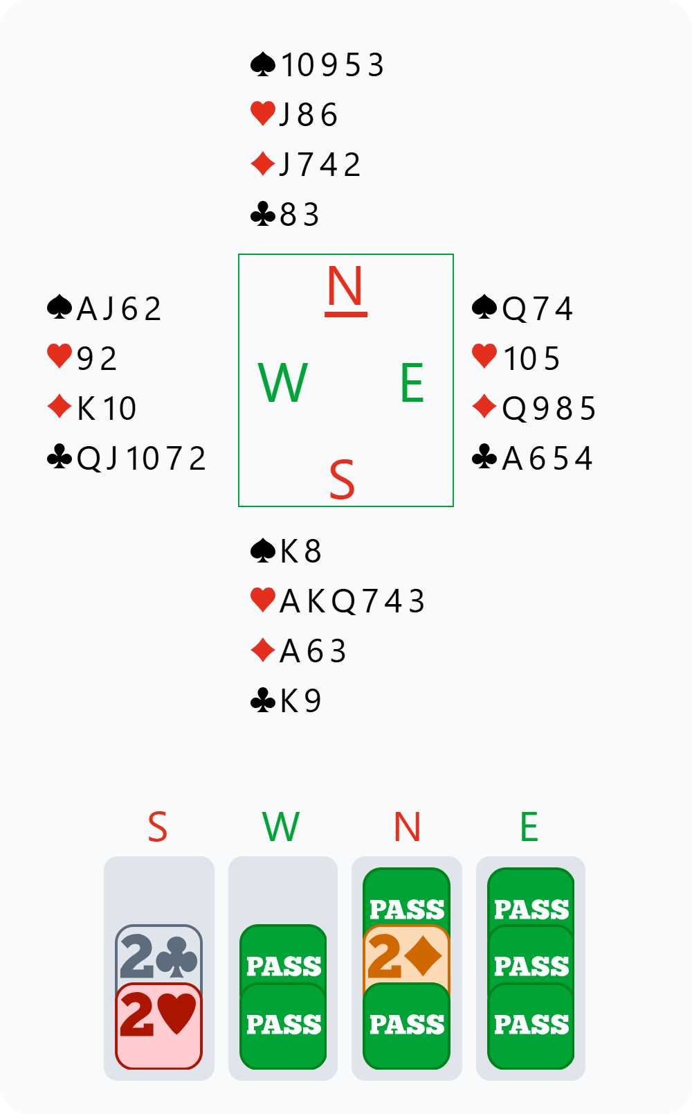This opening shows a solid seven-card minor with very little outside strength. My hand was not perfect for that: holding four Spades and two outside Queens perhaps made it too unbalanced… and probably too strong.