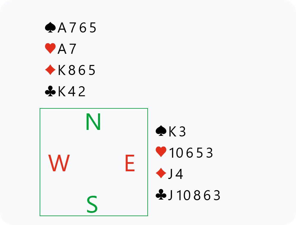At the next trick, he leads the ♣5: West plays the ♣9, dummy the king, and you the ♣6. When he continues with the ♣2, you follow with the ♣8, taken by the ace (you now see the queen with West), and you gain the lead with the ♣J on the third round of the suit (your partner having discarded the ♥2). You are left with hearts, diamonds, and clubs.
