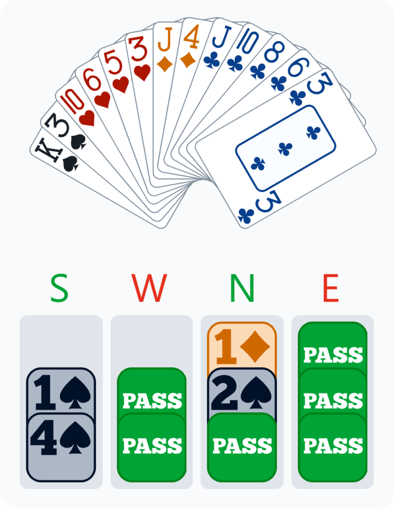 Clearly, the fewer suits you open up, the better off you’ll be. Accordingly, you return the ♥3, confirming to your partner that you originally held four hearts.