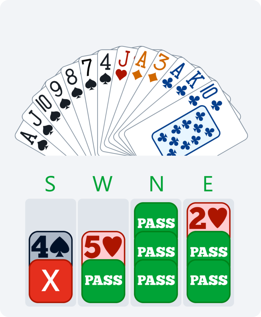 I have this rather exciting hand. After my partner’s initial pass sitting North and the pre-empt from our opponents, I decide to jump straight to 4♠, which I would be very happy to play, and my left-hand opponent continues the pre-empt at 5♥. Now, I’m not going to let them have a free play am I, so I double.