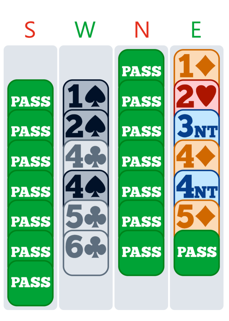 With that, I am about to repeat my spades with 2♠, but I am not sure of the precise meaning of this bid for Théo because we have been playing together for 2 years with a somewhat detailed system, and we decided this year to start again from scratch, playing with just a basic system to avoid any misunderstandings, and to concentrate on how to play the hands. Usually for me, 2♠ is game-forcing with a slightly weaker hand and 5 spades. Thus I usually start with a 2NT limit bid but I don’t think that is the case when playing with Théo – I’m just not sure.