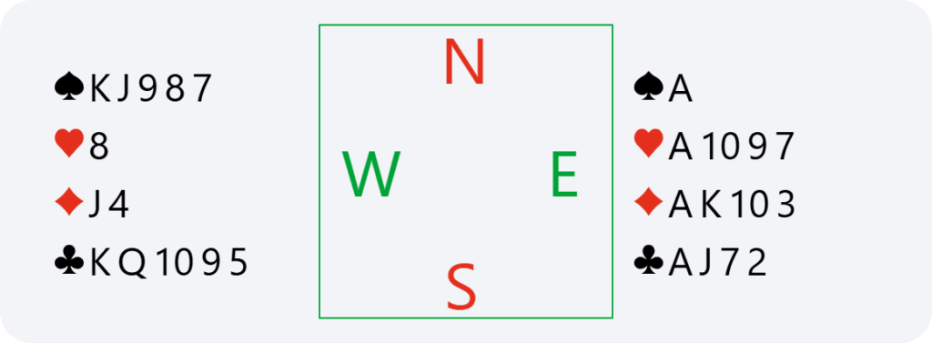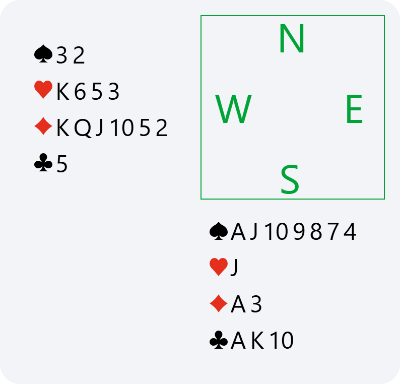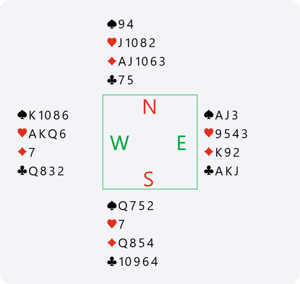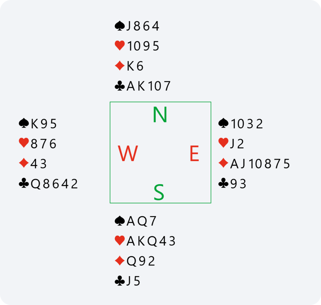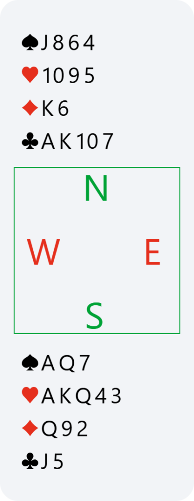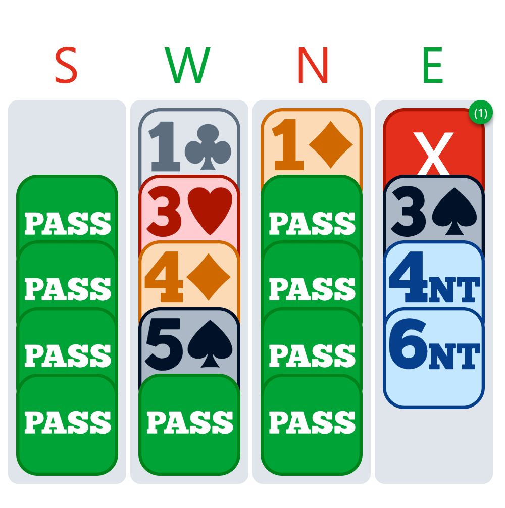 Théo now starts to really think, hesitating between 6♥ and 6NT, contemplating probably 5 club tricks (he would often find me with (5431)), 4 in hearts, 2 in spades and just 1 in diamonds. Thus, possibly the required number of tricks if playing in NT. In addition, if trumps are split 4-1 and I don’t have AKQJ, we would lose one ace and a heart in 6♥, whereas in 6NT, it would always be possible to look for the 12th trick if I have the queen of spades or, as a last resort, with a spade finesse.
