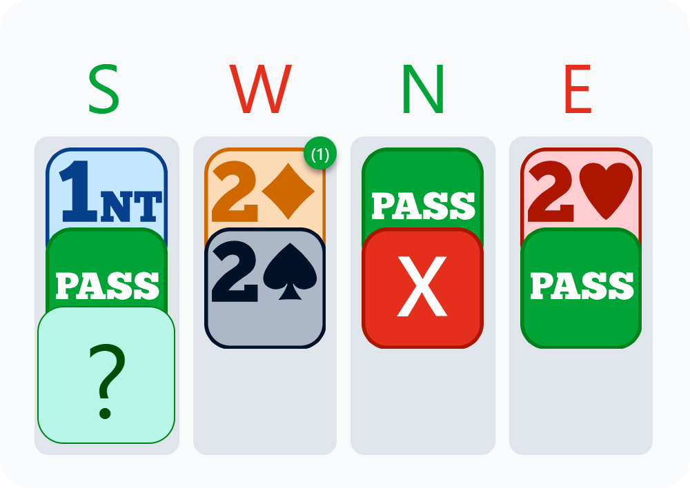 The 2♦ overcall shows a six-card major. In North, I start by passing, since doubling 2♦ would have a penalty-oriented meaning. East bids 2♥, which means: “pass if you have hearts, correct to 2♠ if you have spades.” West duly corrects to 2♠.