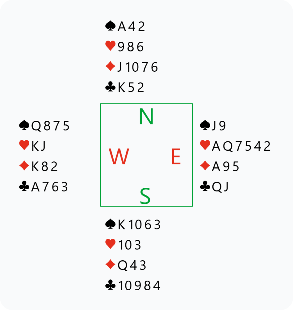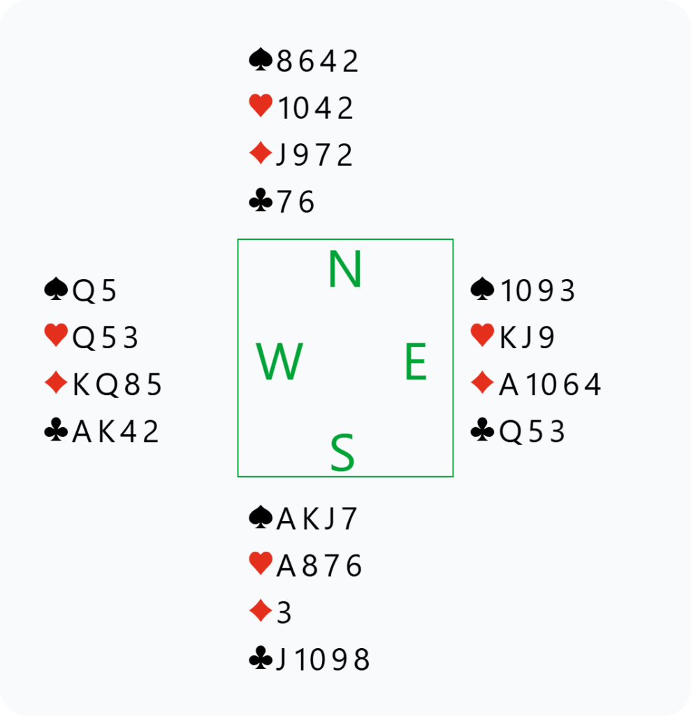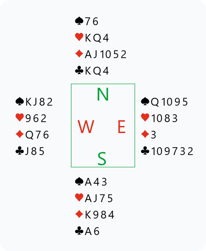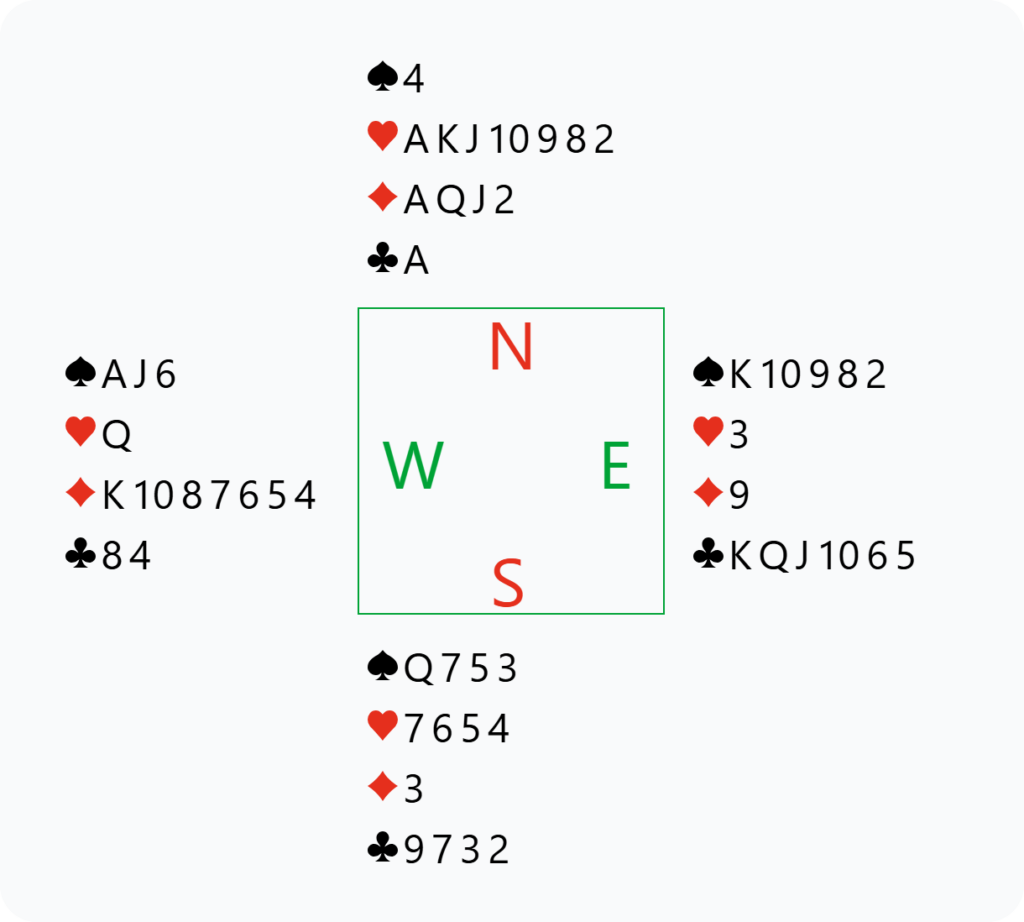 West leads the 5 of clubs. Nathalie cashes her club winners, discarding a spade, then plays the fourth club by discarding her last spade. East, on lead, plays the 10 of diamonds to the king and North’s ace. West continues with a diamond to Nathalie’s queen, who then plays the king of hearts, taken by West’s ace. Nathalie concedes one more diamond trick before being able to claim the rest, the jack of hearts being doubleton.