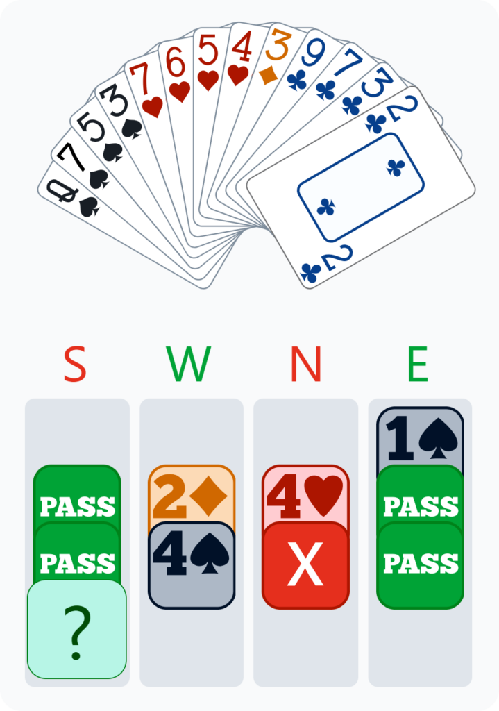 My partner’s double shows a strong 4♥ bid, with a clear intention to bid further. In this context, passing is very rare.