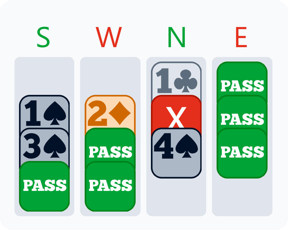 North has a hand too strong to open 1NT, with 17 HCP, a fine five-card suit, and seven immediate tricks. After West’s overcall, his double shows three Spades with a sound opening.