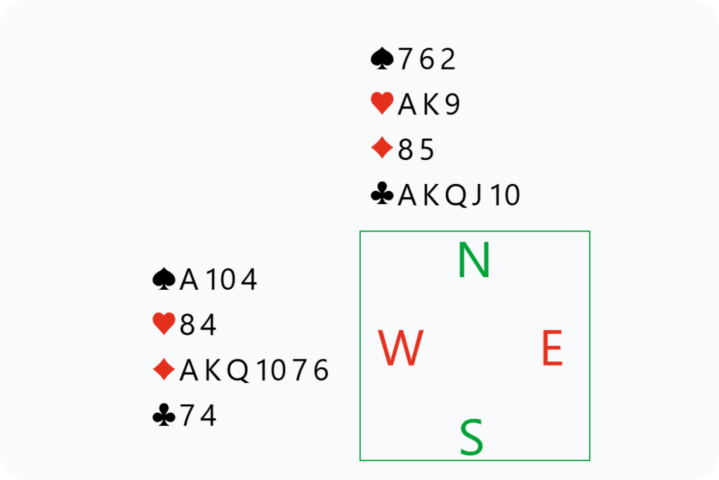 West leads the Ace of Diamonds. East follows with the 2 and South with the 4. He continues with the King, for East’s 9 and South’s Jack…