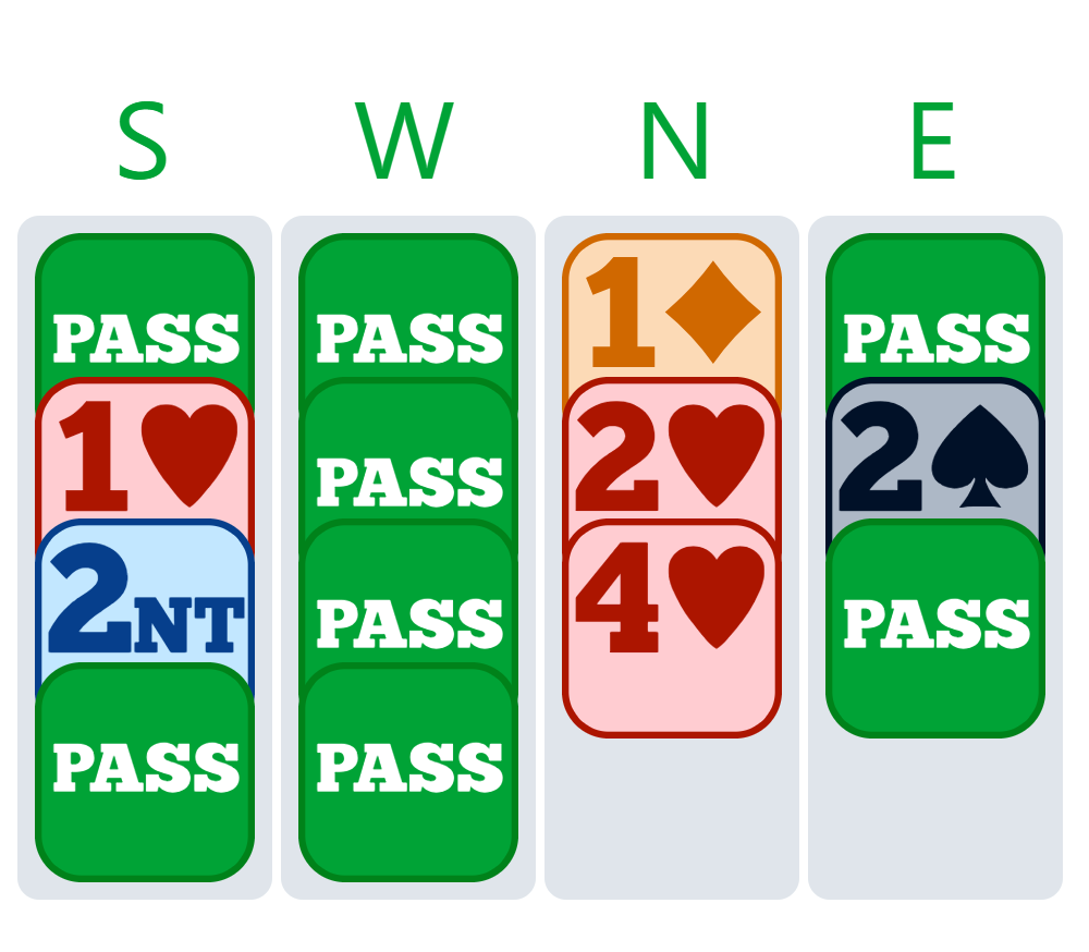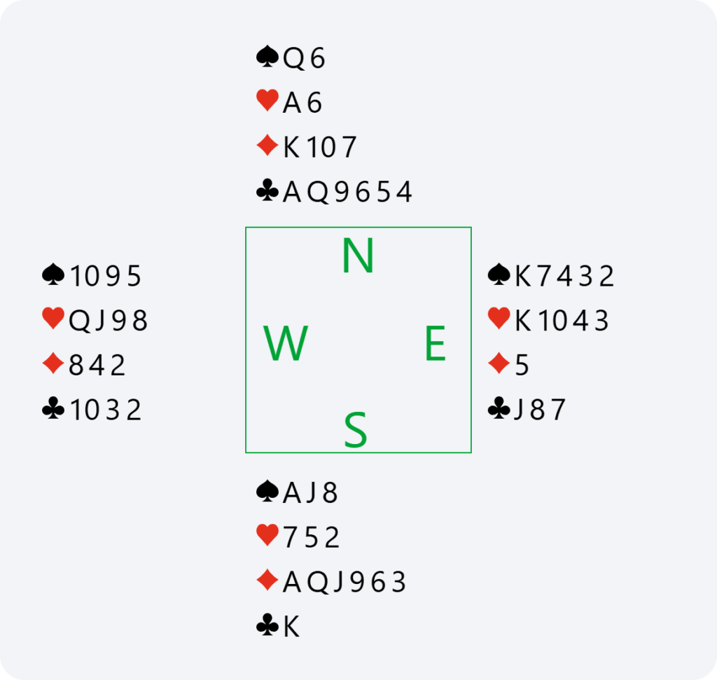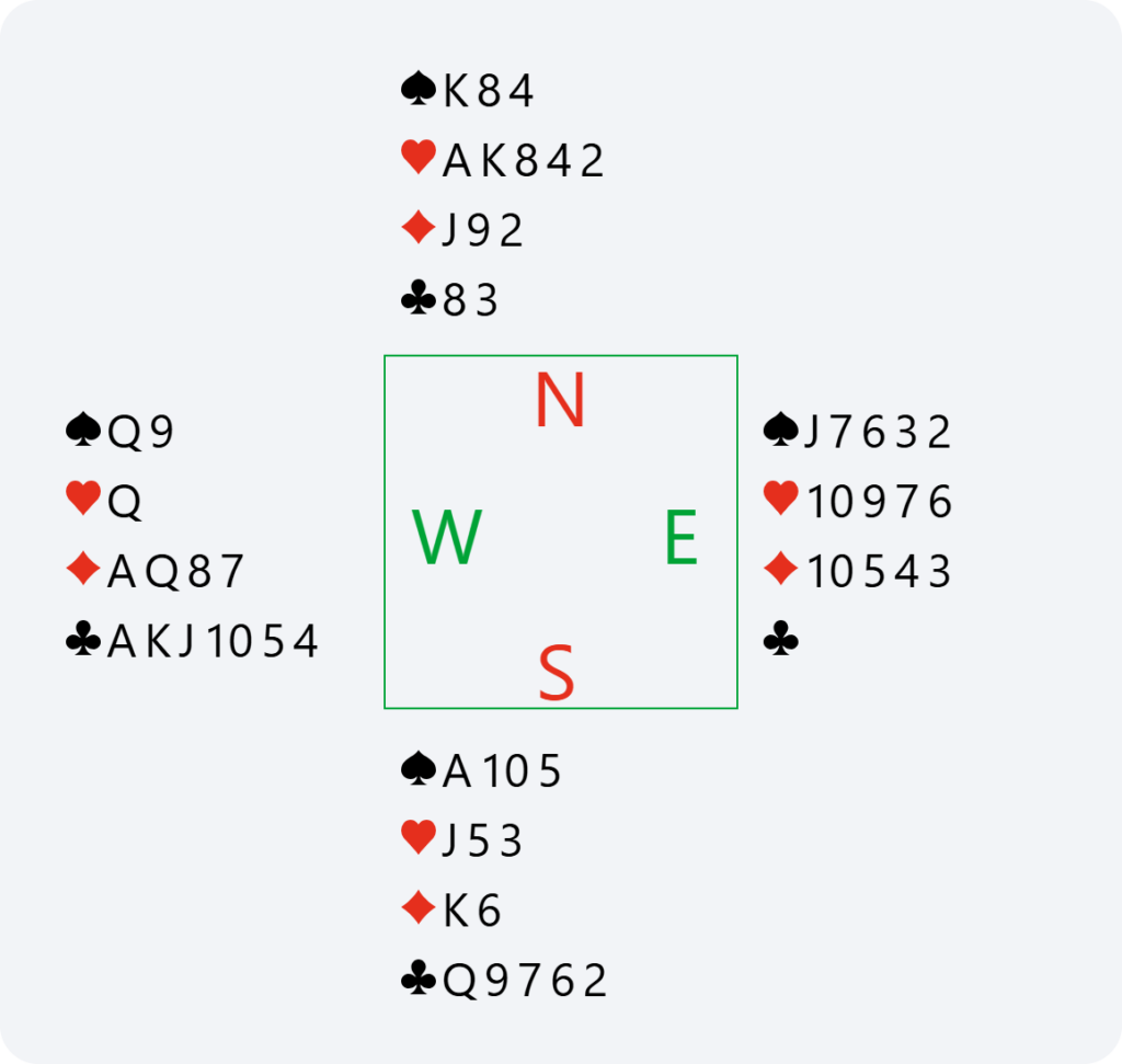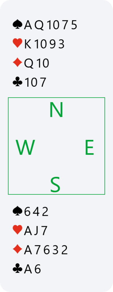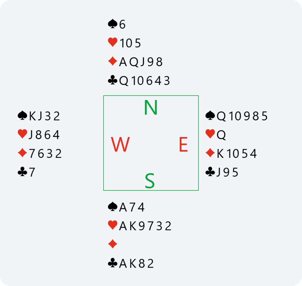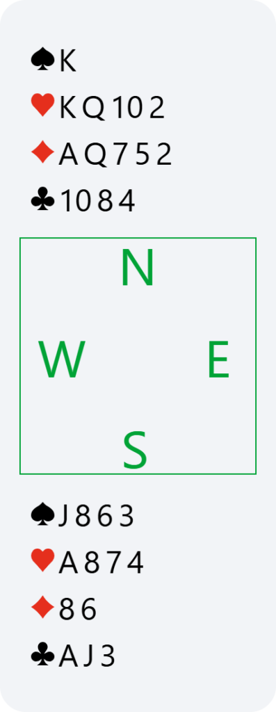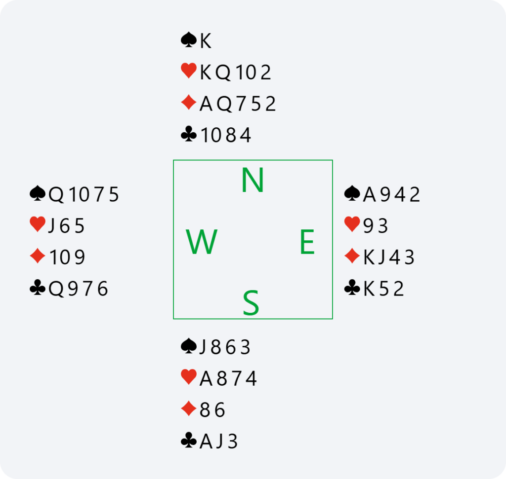 So I played my three rounds of hearts, only to see them discard on the third round. I could then play the 5 of diamonds to East’s 4 and discard from my hand!