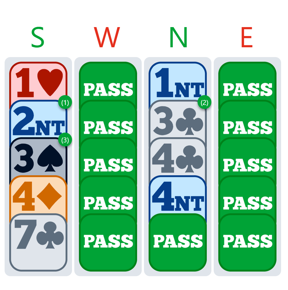 Here was the sequence at our table (North-South): 2NT shows 6 hearts and 4 cards in an undisclosed minor, and a hand of at least 16 points. 3♣ is a relay, 3♠ describes 4 clubs and 18+ points.