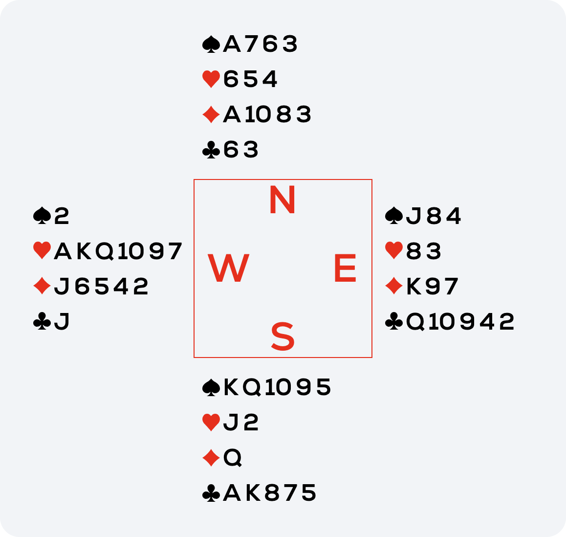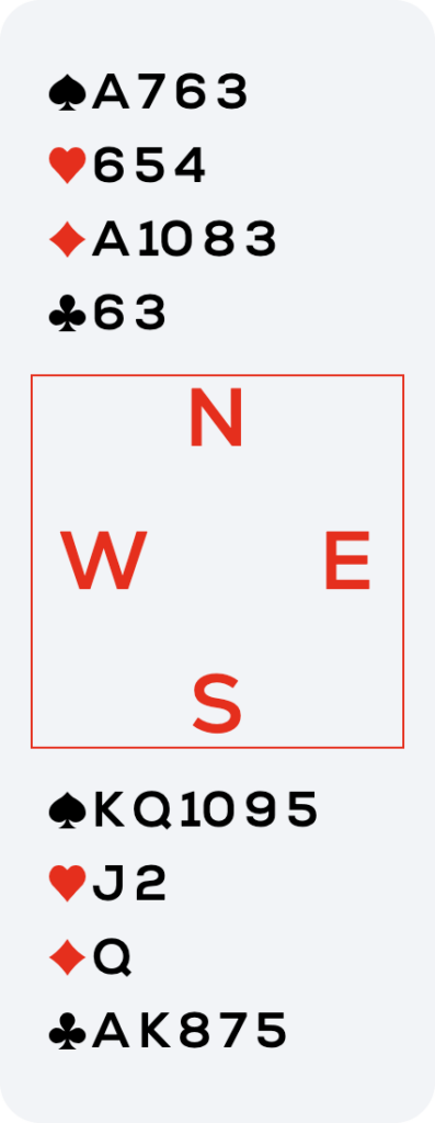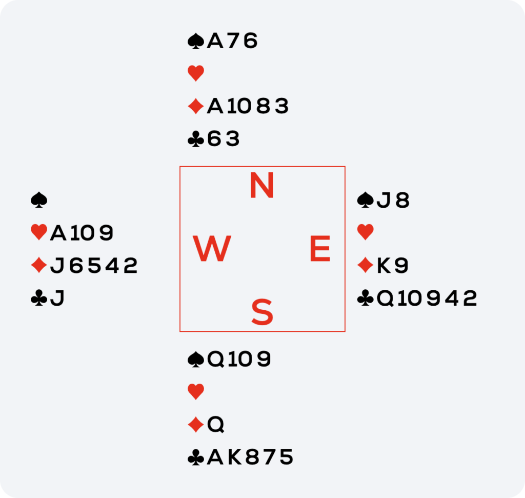 So I played a top club. Both opponents followed, West with the jack. Then I played the other top club. West discarded the ♥9. I was right! West’s distribution was 1-6-5-1. I continued to cross-ruff the rest and ended up with eleven tricks.