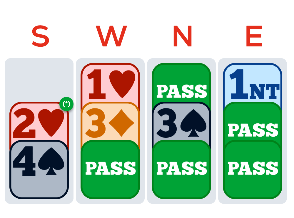 West opened 1♥, East responded 1NT and using the Michaels convention, I called 2♥, a cuebid showing a two-suiter in spades and one of the minors. West now bid 3♦ and partner supported me with 3♠. East passed and having some extras, I said 4♠, which ended the bidding.