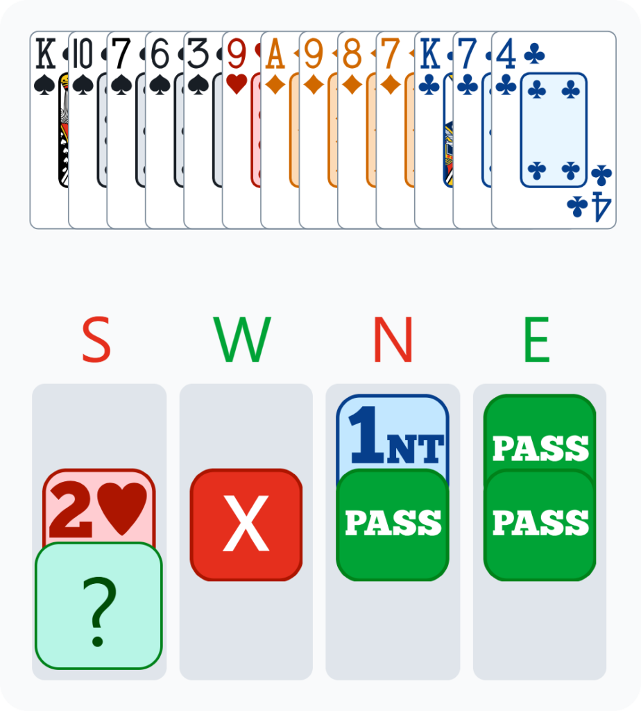 When the transfer is doubled, we must take advantage of the additional calls we now have at our disposal to specify the number of opener’s Spades, but also if he wishes to be declarer or not. After all we now know that there is a possible danger coming