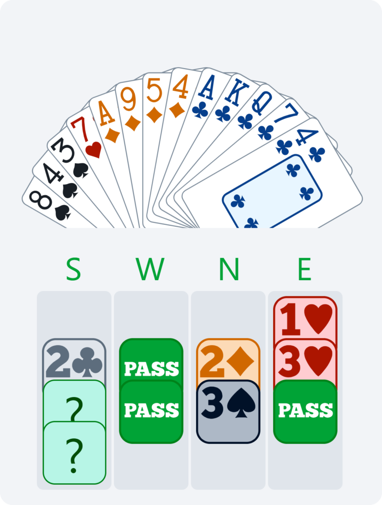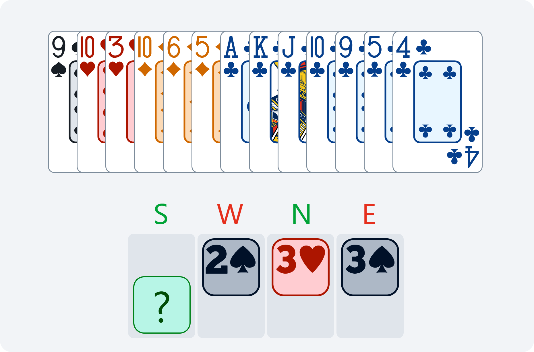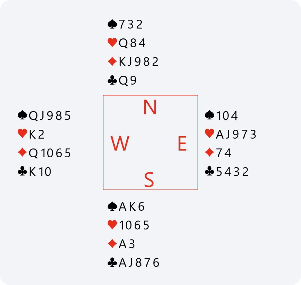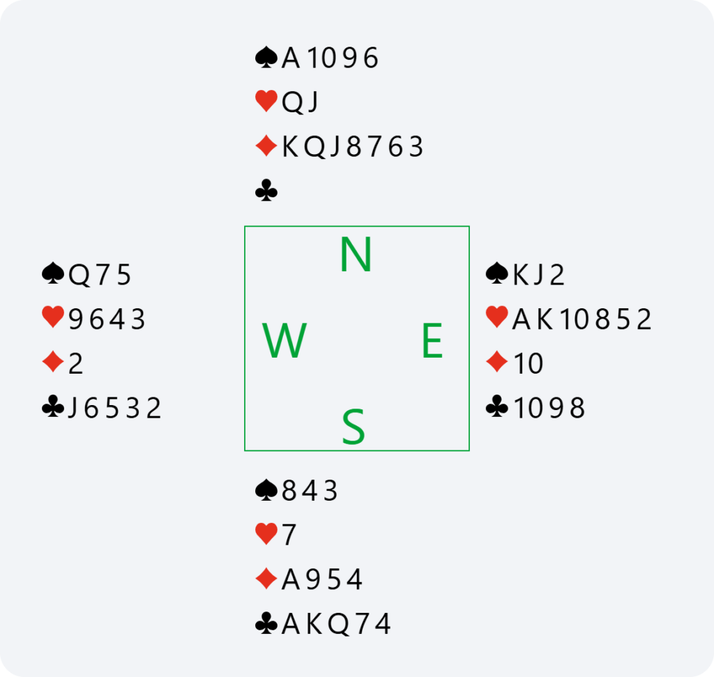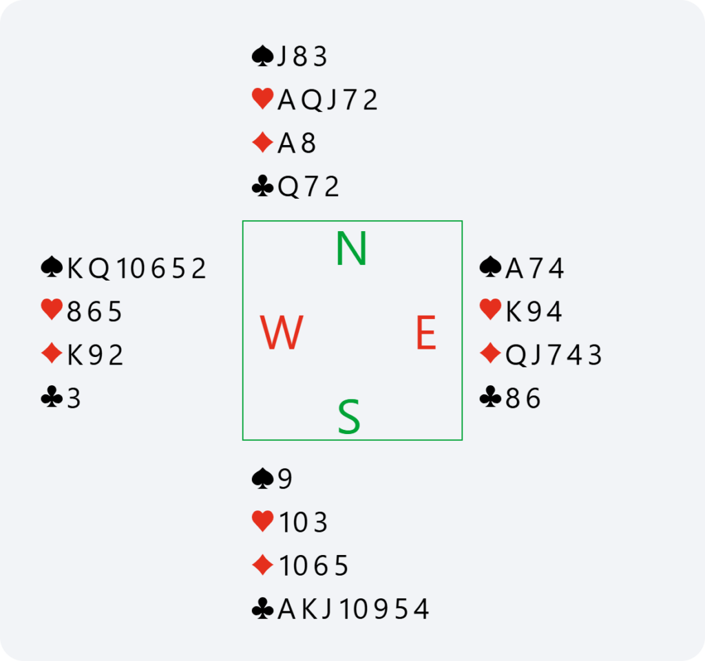 Here is a deal played against our friends Nao and Eulalie. I am sitting South. The bidding reaches 3♠ when it’s my turn to speak, and I know that I have to make a bid opposite my partner’s good opening and minimum of five hearts.