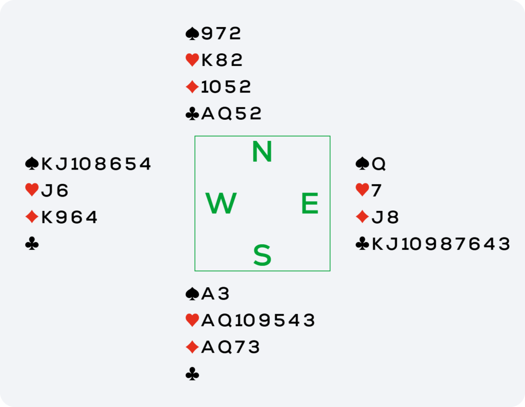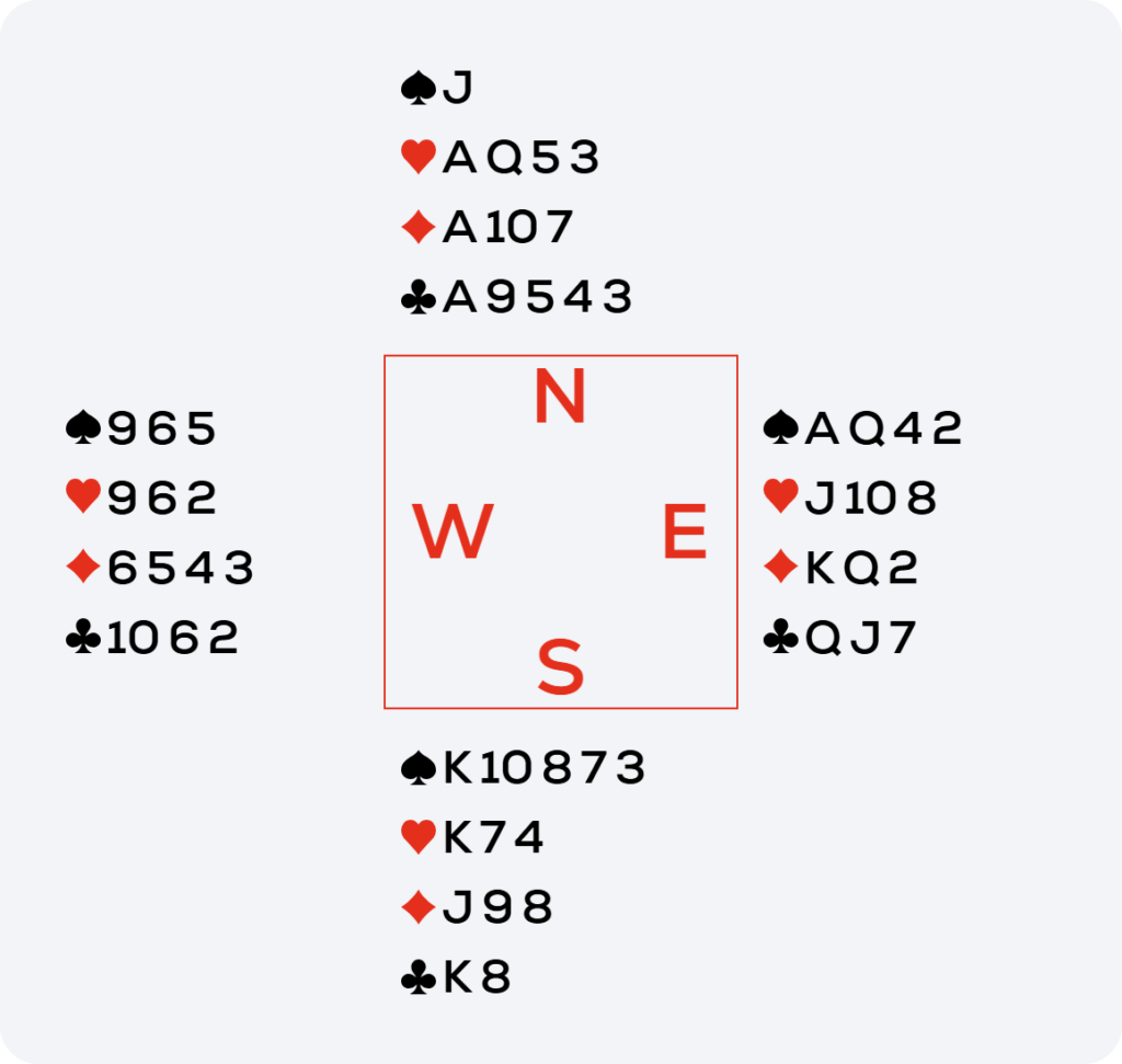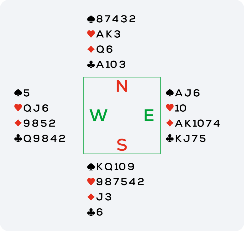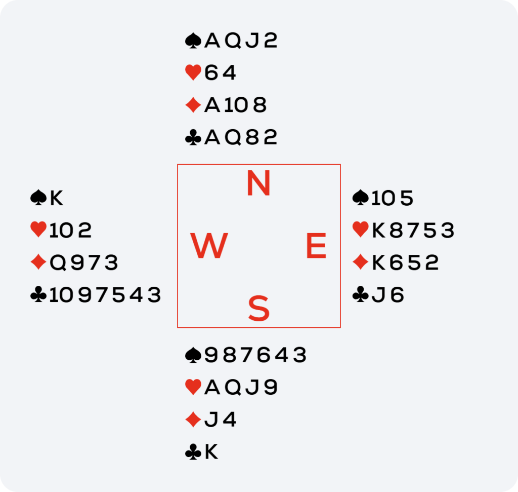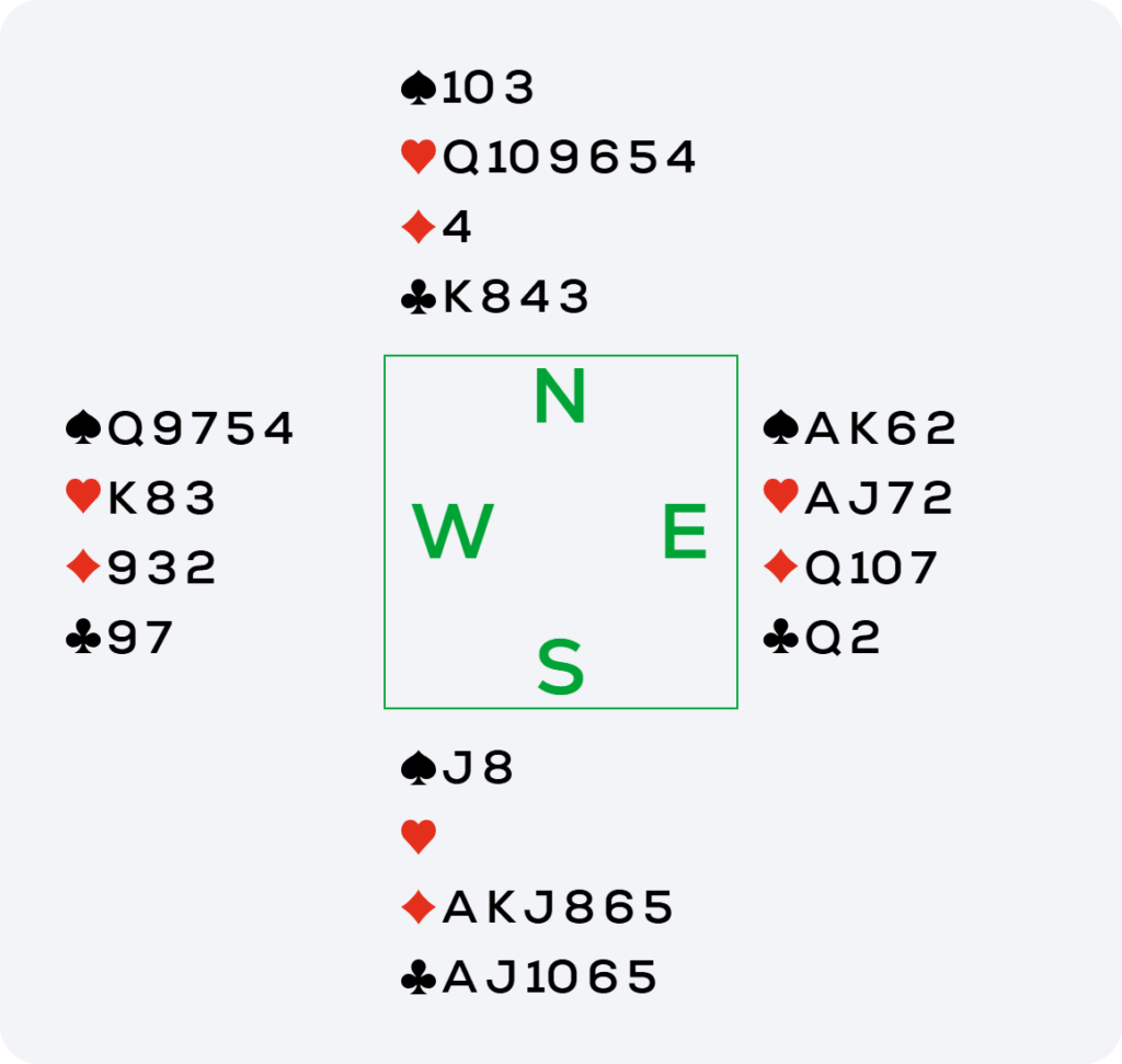 Then he quietly signed off in 6♥ with an ace and the trump king. Result: 6♥= after giving a diamond.