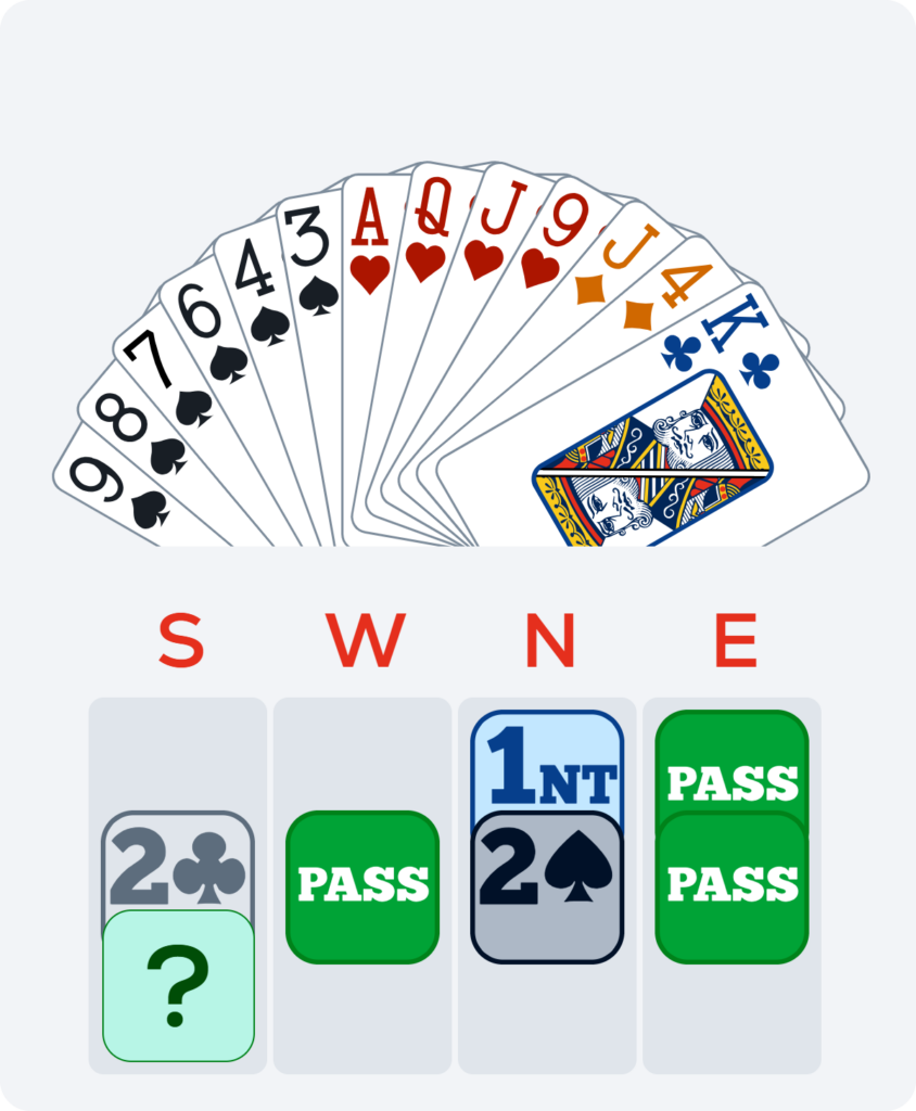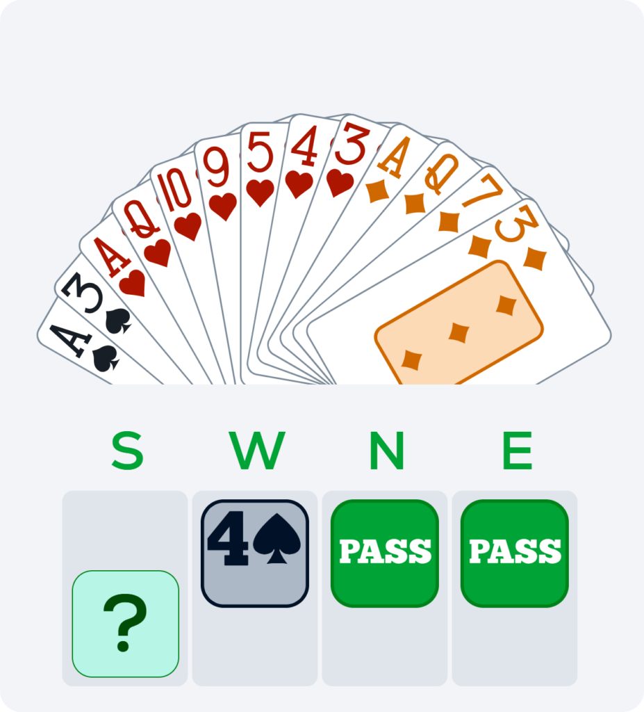 1♦ at my right. I really wanted to overcall, but 1♥ bothered me given the poor quality of my hearts compared to my spades, which I probably won’t be able to bid.