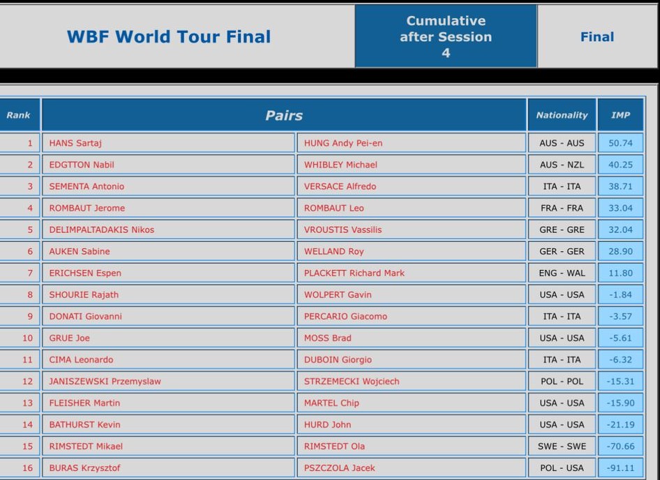 The WBT (World Bridge Tour) final officially started on Wednesday with two days of intense competition. The concept? The 16 best pairs available come together for an ultra-competitive championship. Each pair takes on the 15 others in mini-matches of 6 deals with Butler format.