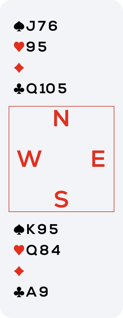 From the above position, I led a heart from dummy to my ♥Q (East followed low), then another heart, which West won with the ♥J. Now, with only diamonds and clubs left, West exited with a club. Hopeful, I played low from dummy, East followed low and my ♣9 won! West had held the ♣J.