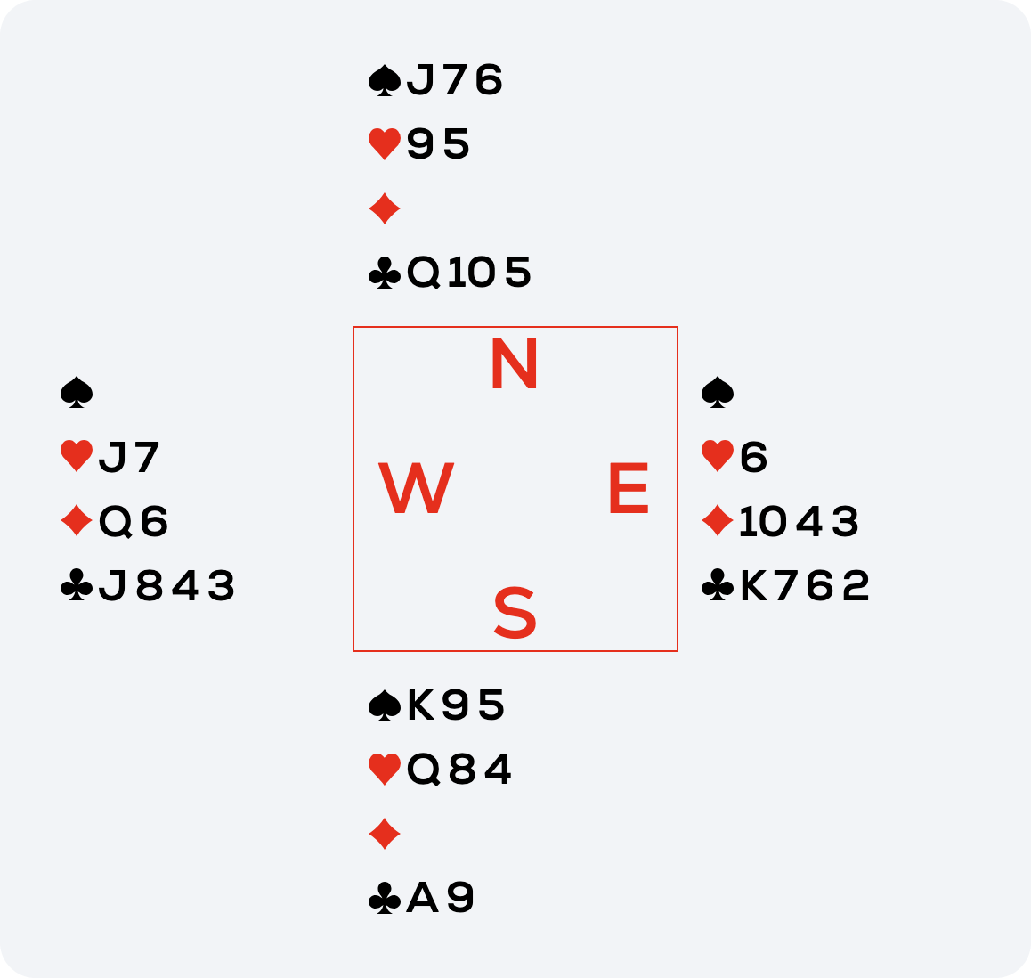Let’s review the auction: both opponents had initially passed, yet West then made a take-out double. This suggests that West held close to 11 points, short spades and a three-suited hand. So far, West had shown 9 points—the ♠A, ♦K and ♦Q—, meaning East should have the ♣K. Based on West’s high-low heart play (and given they use 3rd/5th leads), they likely began with four hearts, so they probably held the ♥J as well. The location of the ♣J was unclear.