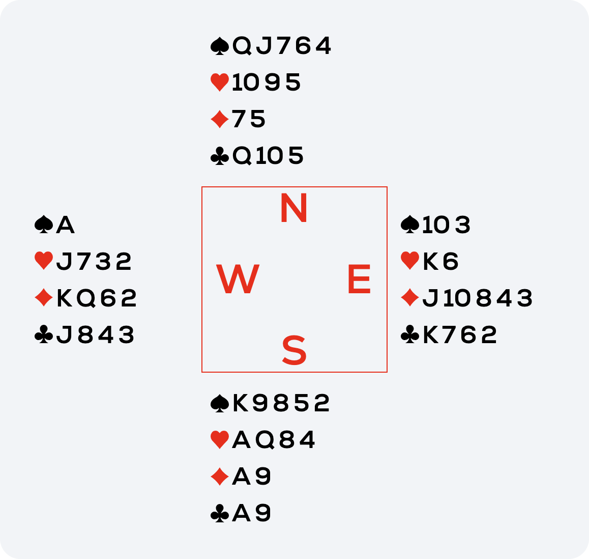 Still, what chances did I have? Assuming West had at least one of the heart honours, I needed the opponents to open the heart or club suits to my advantage. On the opening lead, East played the ♦J (likely showing the 10) and I ducked to disrupt their communications. West continued with the ♦2 and I won the ♦A.