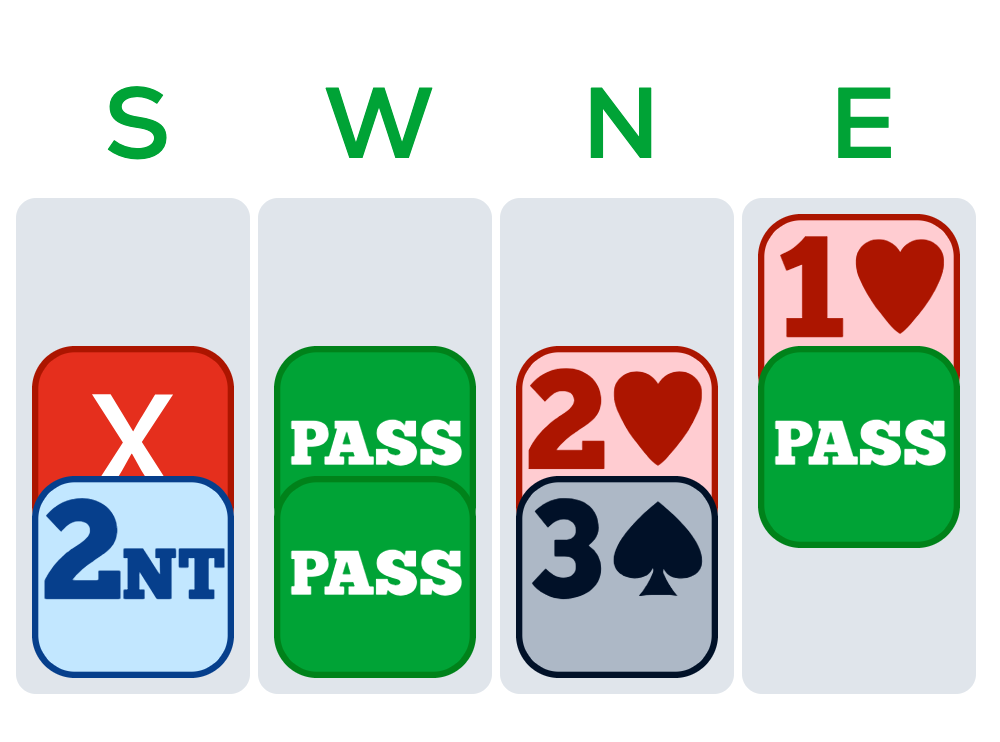 › South made a take-out Double: he has the values of an opening bid and at least three cards in the three other suits (sometimes only two in a minor) or a strong hand.