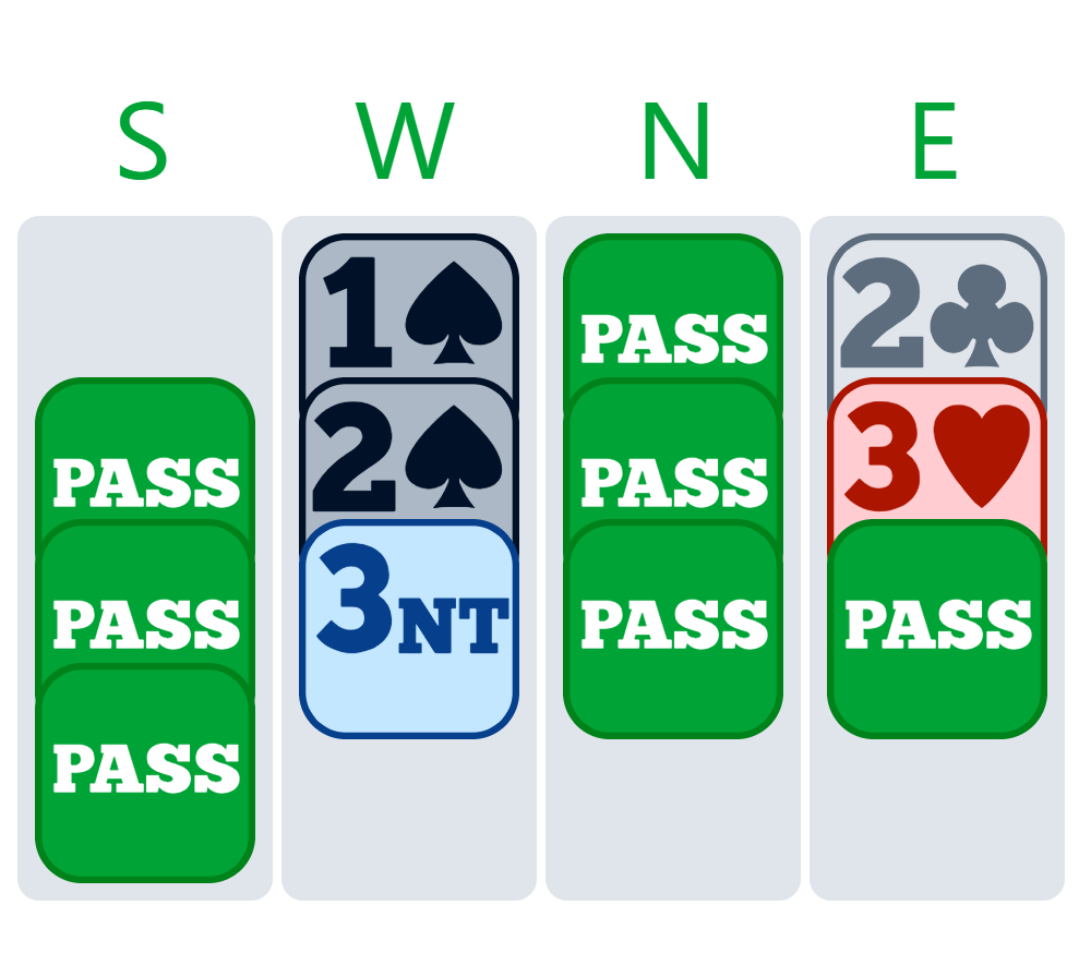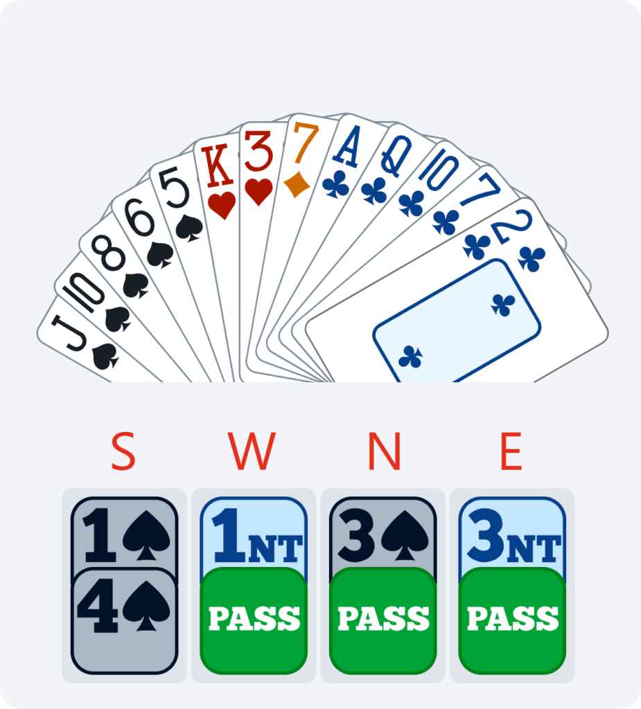 Anaïs made the 3♠ pre-emptive bid over 1NT, showing four trumps and a short suit when vulnerable, and I had to make a decision after 3NT.