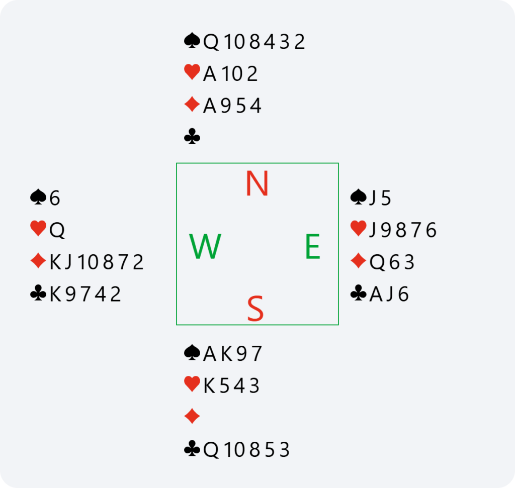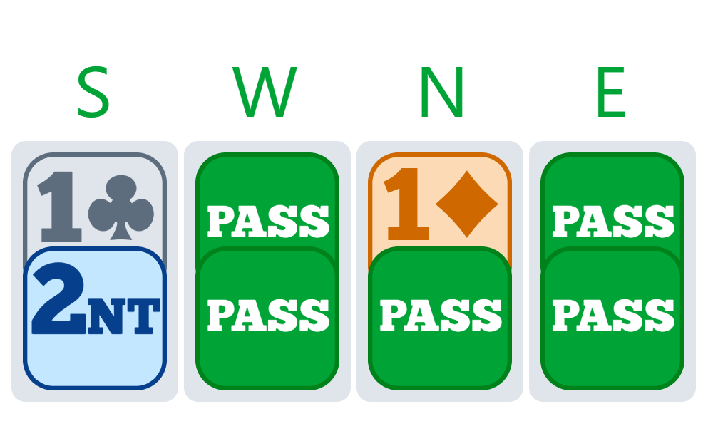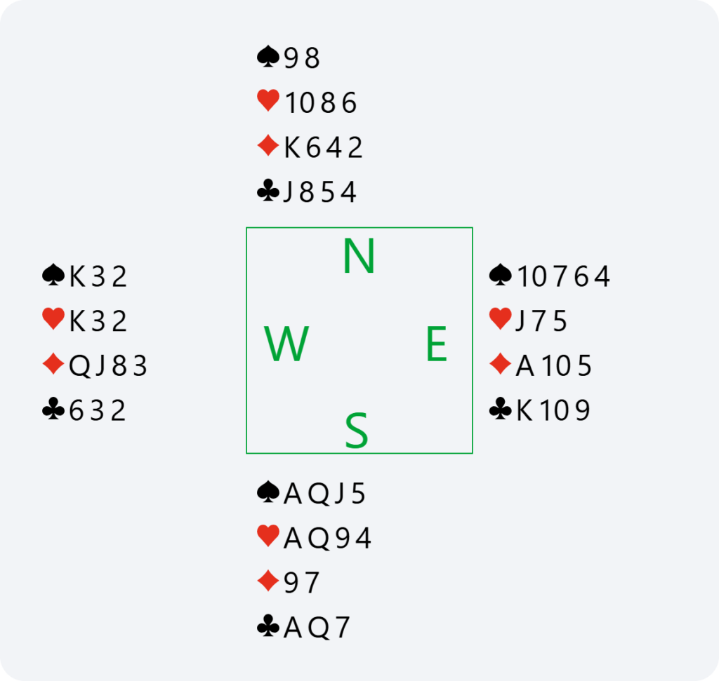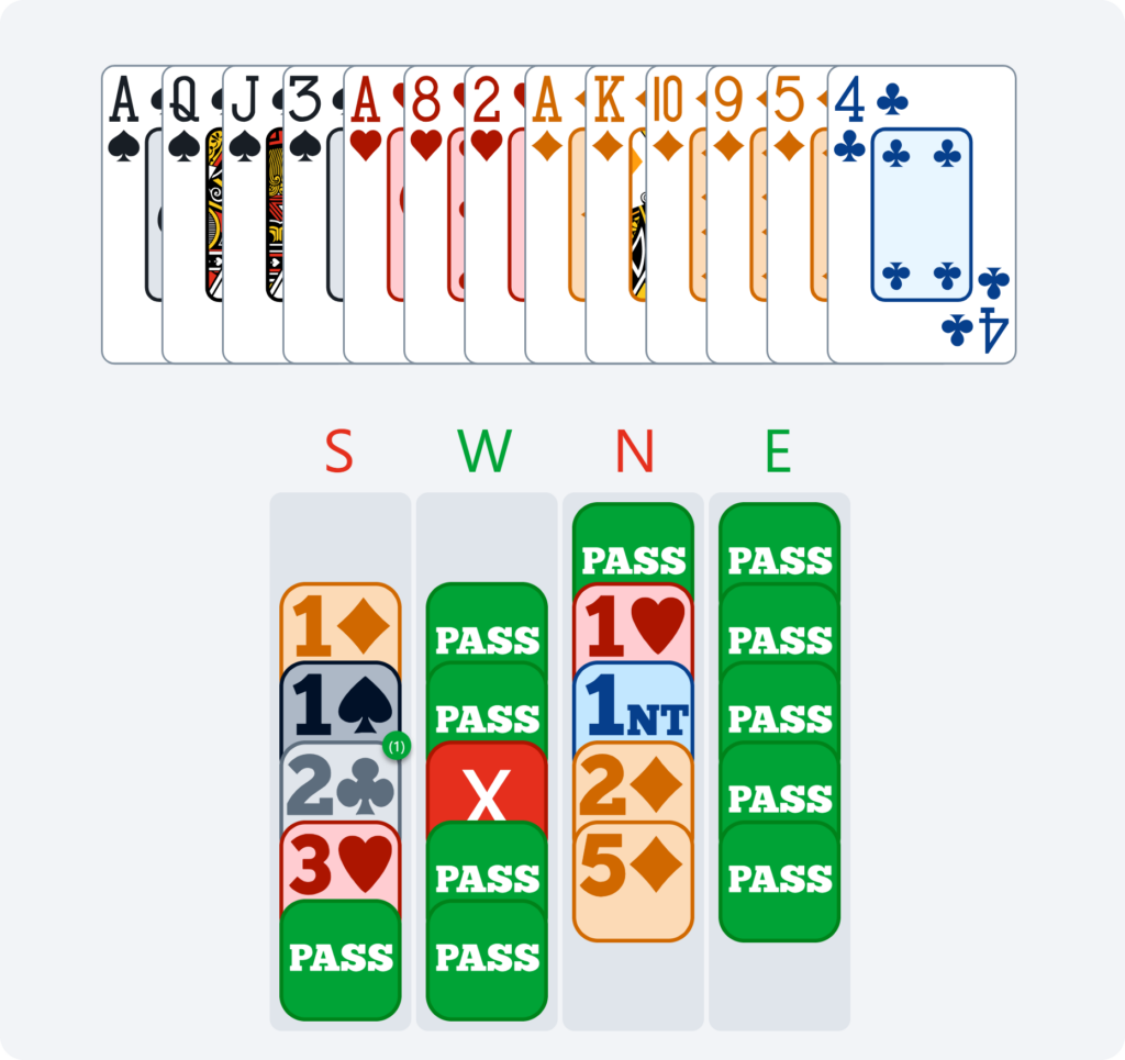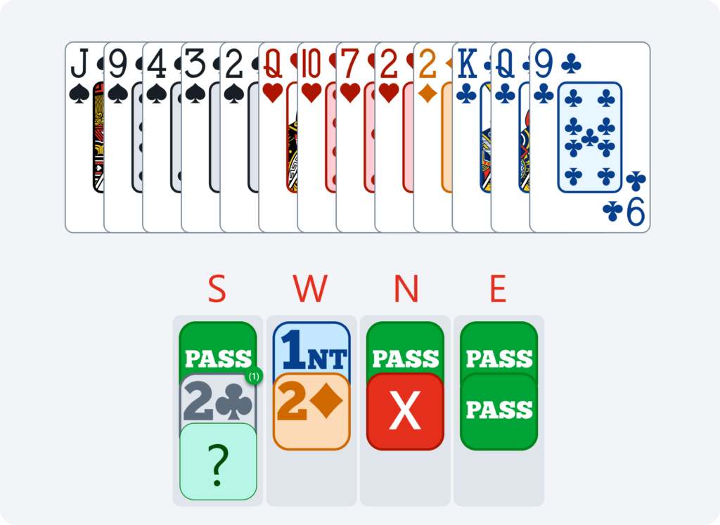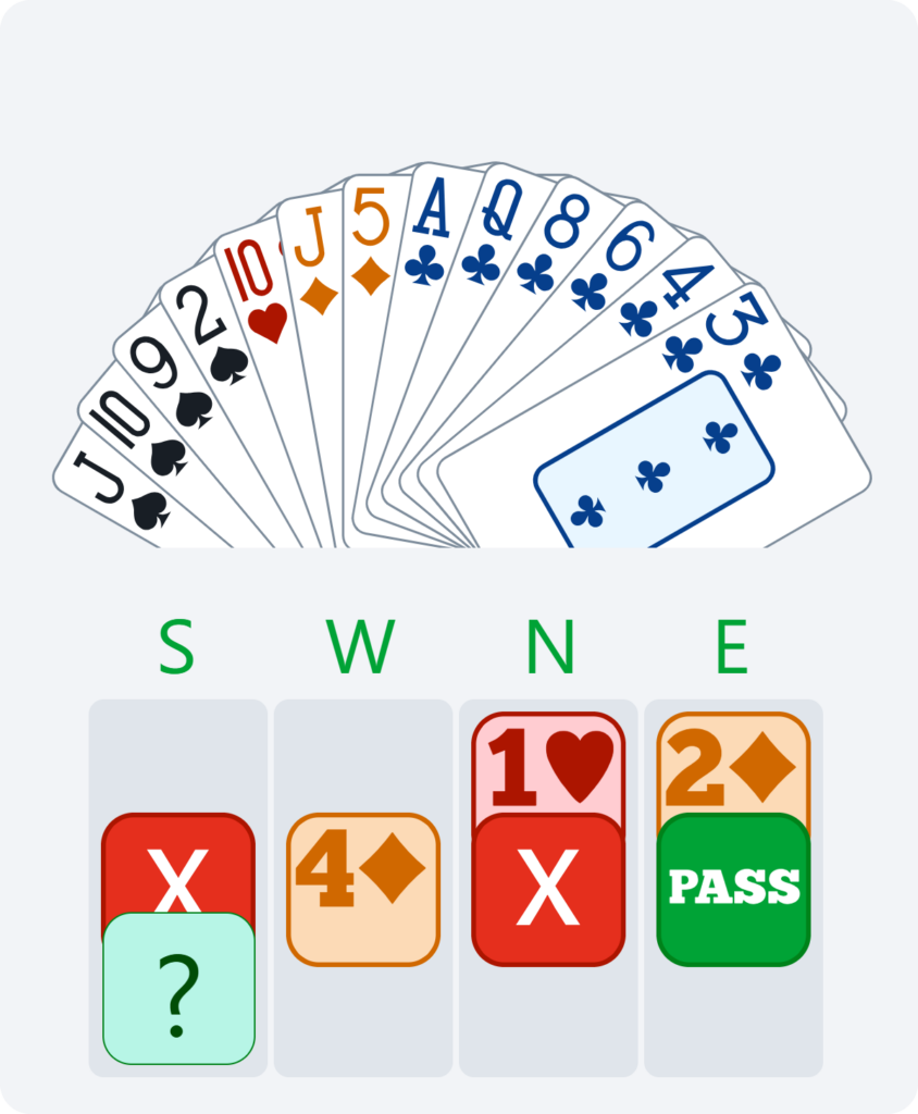 Here, if North passes 2♦, we have no reason to bid again in South. We have already announced our hand, and it would become dangerous to continue bidding without any guaranteed fit. This is why doubling 2♦ is very useful for saying “show your best major” and avoiding the 2♦ contract or having to guess your partner’s major.