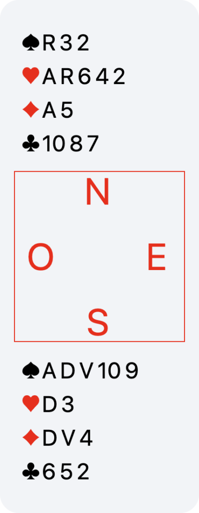 Entame : As, Roi et Dame de Trèfle (Est fournit dans l’ordre le 3, le 4 et le Valet). Ouest contre-attaque du 3 de Carreau…