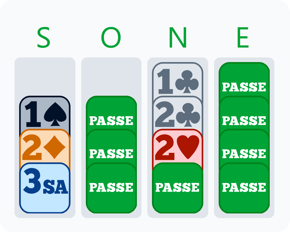 « 2 est une quatrième couleur qui ne promet ni ne dénie rien. Ta conclusion à 3SA avec un singleton à Cœur n’a aucun sens. Tu dois commencer par me soutenir à Trèfle en disant 3 en situation forcing et ensuite, on verra. »