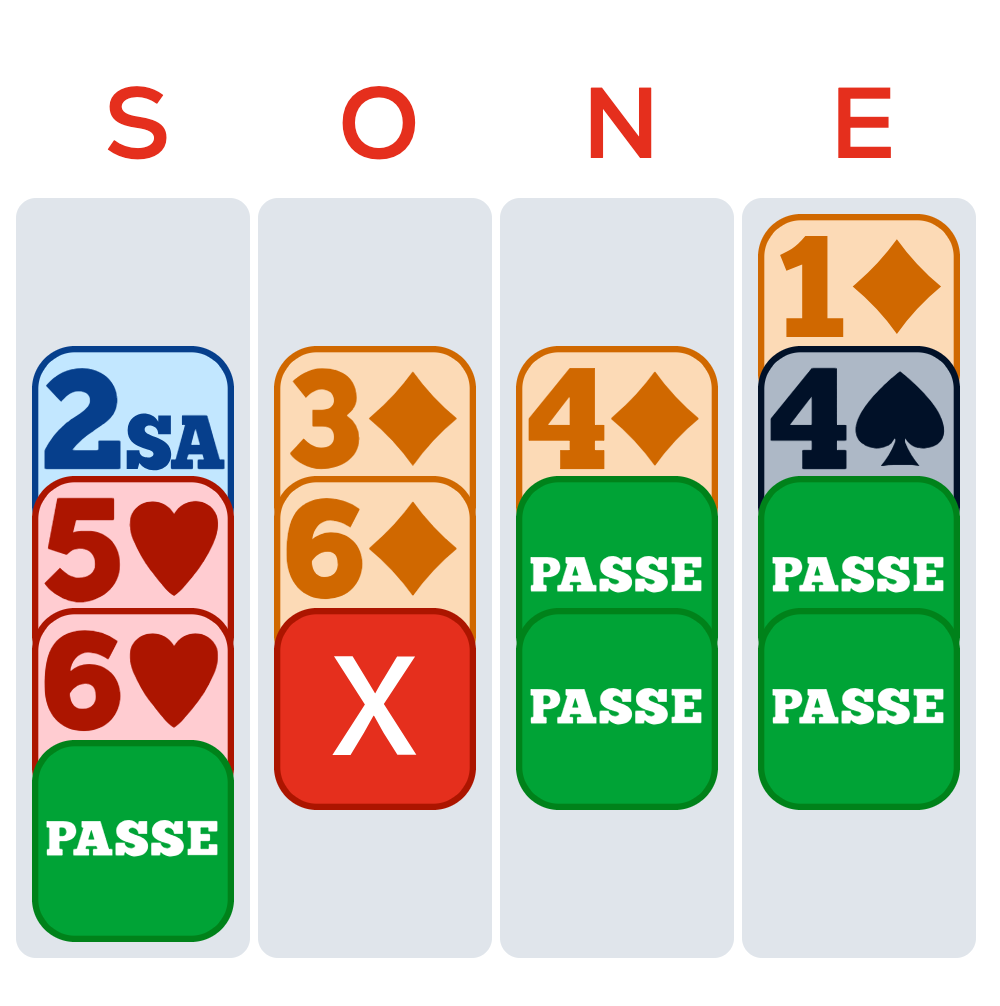 Ouille ! … La main présentée en tête d’article est celle de Nord, pas celle de Sud ! Sud a bien le bicolore C/T pour son intervention à 2SA. De plus, le 4 de C dans la main présentée en tête d’article doit être remplacé par le 4 de K !