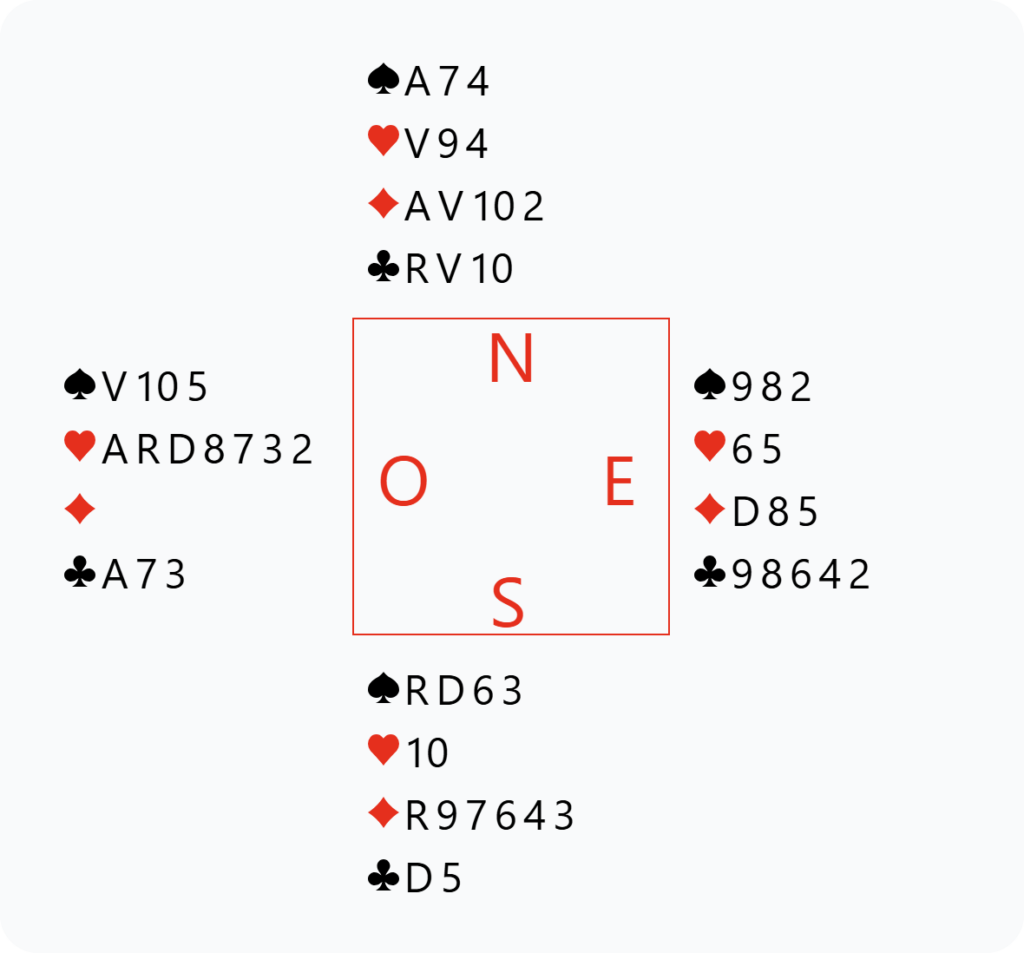 Sur cette ouverture, Théo possède une main énorme et contre immédiatement, avec l’intention de montrer les Cœurs ensuite. L’adversaire à droite passe et c’est à moi d’enchérir.