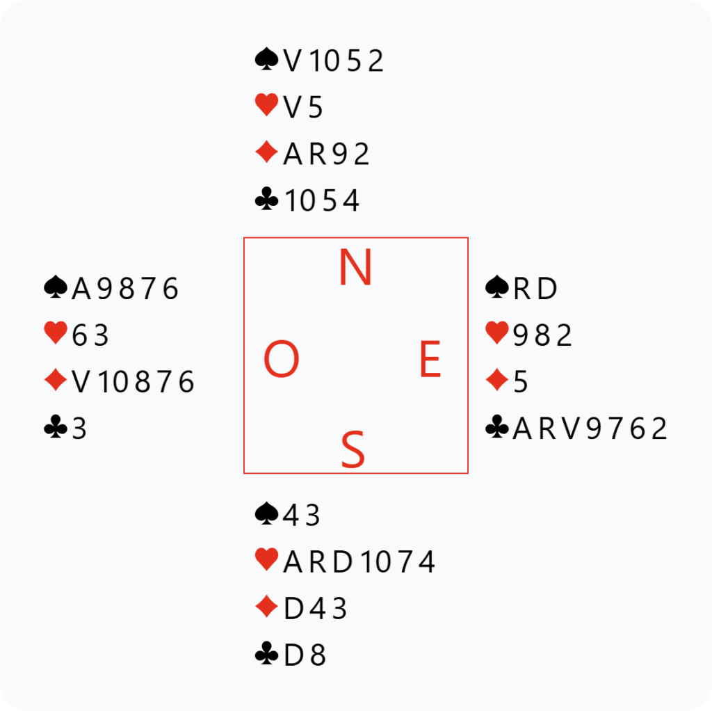 En Sud, nous annonçons d’abord nos quatre Piques, puis Ouest débarque directement au palier de 4♥, avec ses “huit levées de tête”. Mais Grégoire ne se laisse pas impressionner et conclut à 5♦, avec une confiance totale en son partenaire, qui a déjà décrit de beaux Carreaux.