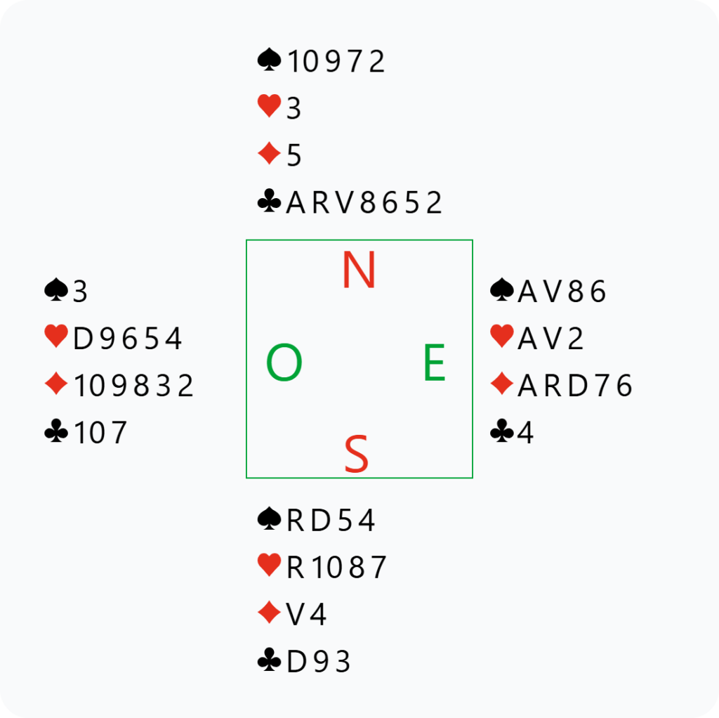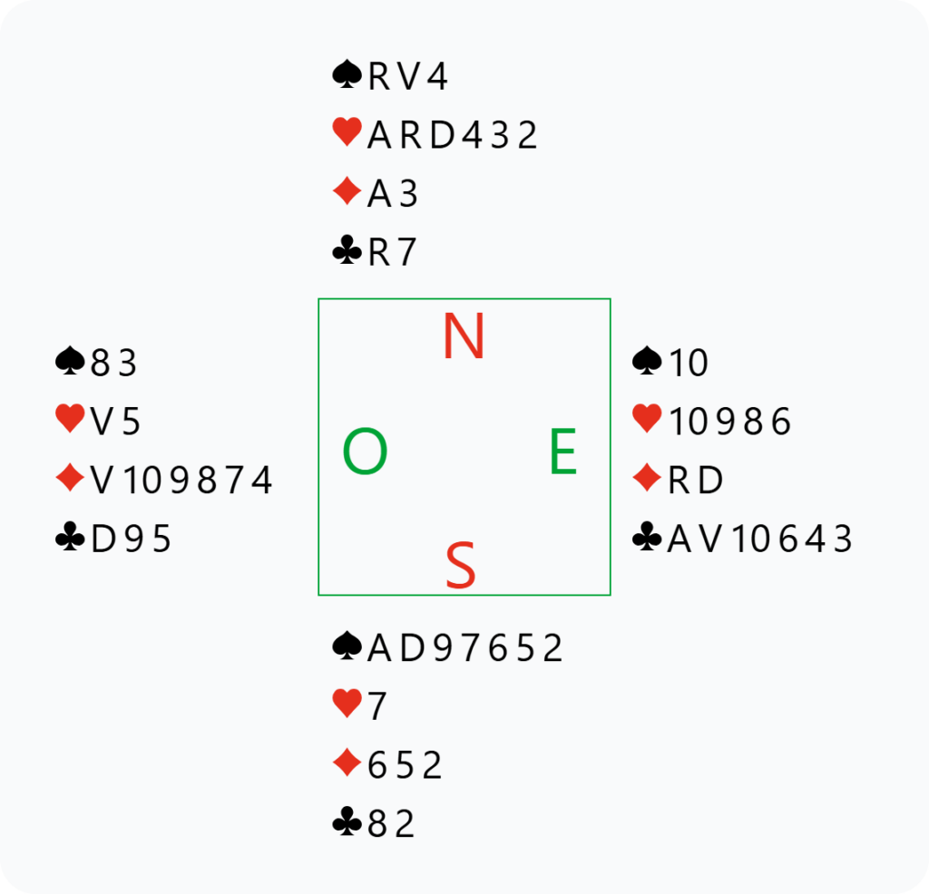 L’entame d’Est est le 6 de Cœur, pour la Dame du partenaire, qui retourne As de Trèfle, puis un autre trèfle pour ma Dame.