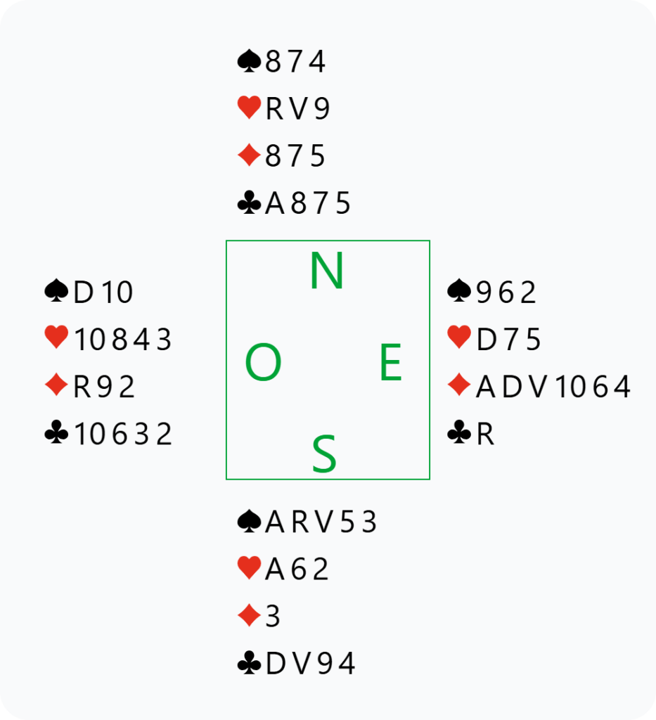 À ce stade, le contrat est presque assuré : au vu des enchères, il est clair qu’Ouest ne possède pas la Dame troisième à Carreau : c’est la théorie des places vacantes. Ouest ayant déjà montré 8 cartes à Cœur, il est plus court dans les autres couleurs que son partenaire qui n’a pas de couleur longue affichée.
