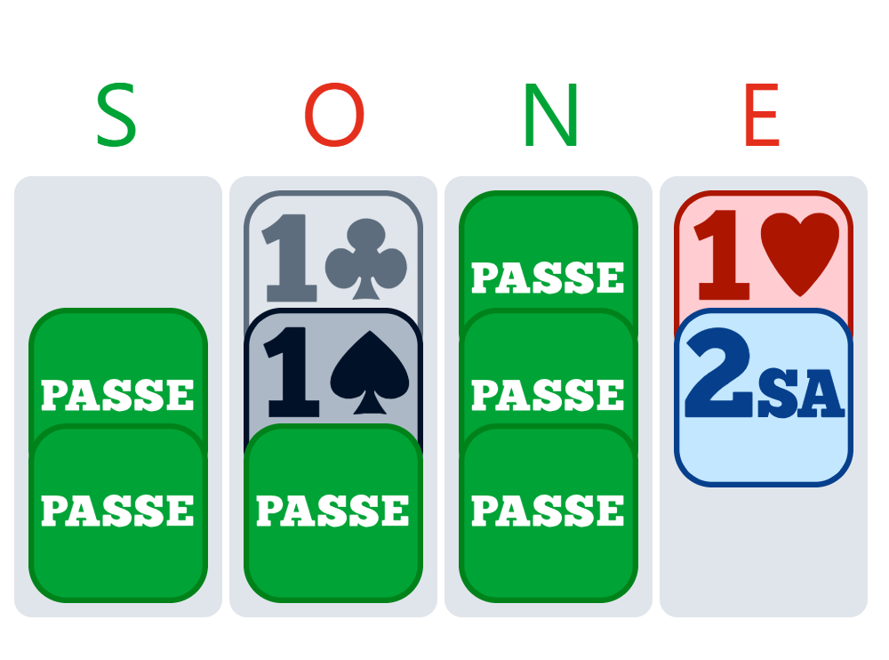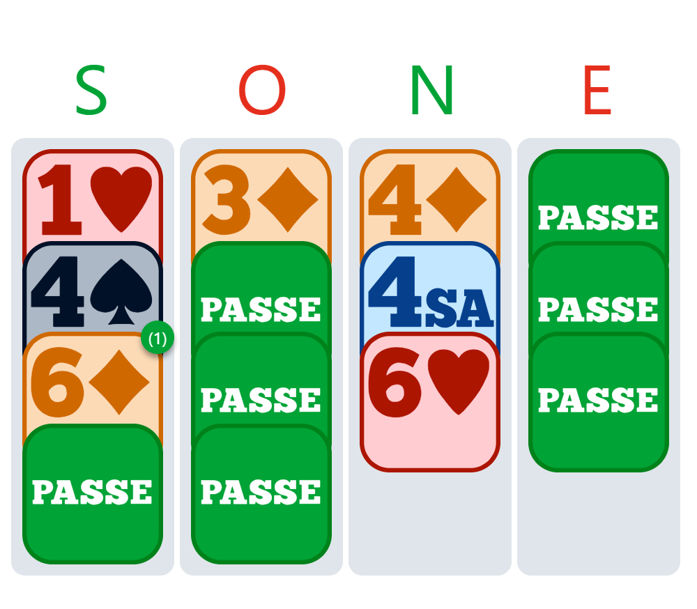 Lorsque les enchères montent rapidement, il peut être difficile de suivre. J’étais assise en Sud. Voici la séquence :