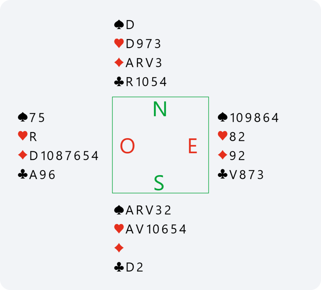J’ai continué avec un Trèfle pour la Dame de Niels, et il a également encaissé l’As de Trèfle. Niels a ensuite rejoué un Carreau, que j’ai pris de l’As. J’ai alors pu encaisser le 13ème Trèfle et le Roi de Cœur. Deux de chute et un bon score pour nous.
