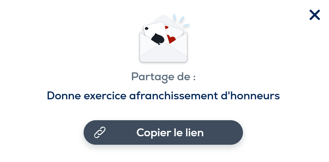 Pour cela, accédez à votre bibliothèque personnelle de donnes, sélectionnez une donne sauvegardée puis cliquez sur « Partager » pour obtenir un lien à partager à vos amis bridgeurs. Ils pourront jouer la donne avec ou sans compte Funbridge.