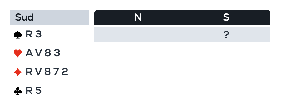› Votre seule solution est de choisir 2, une enchère qui peut aussi provenir de ♠7 ♥R74 ♦AD10873 ♣DV5, sur laquelle le partenaire aura bien du mal à continuer d’enchérir.