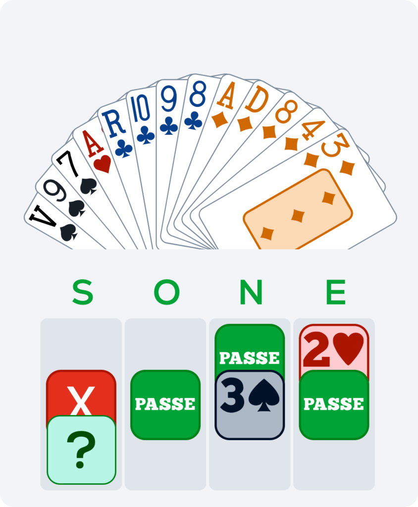 3SA peut être le bon contrat si votre partenaire a le Roi de Carreau accompagné d’As – Dame de Trèfle, et plus généralement dès que les Piques sont très mal partagés.