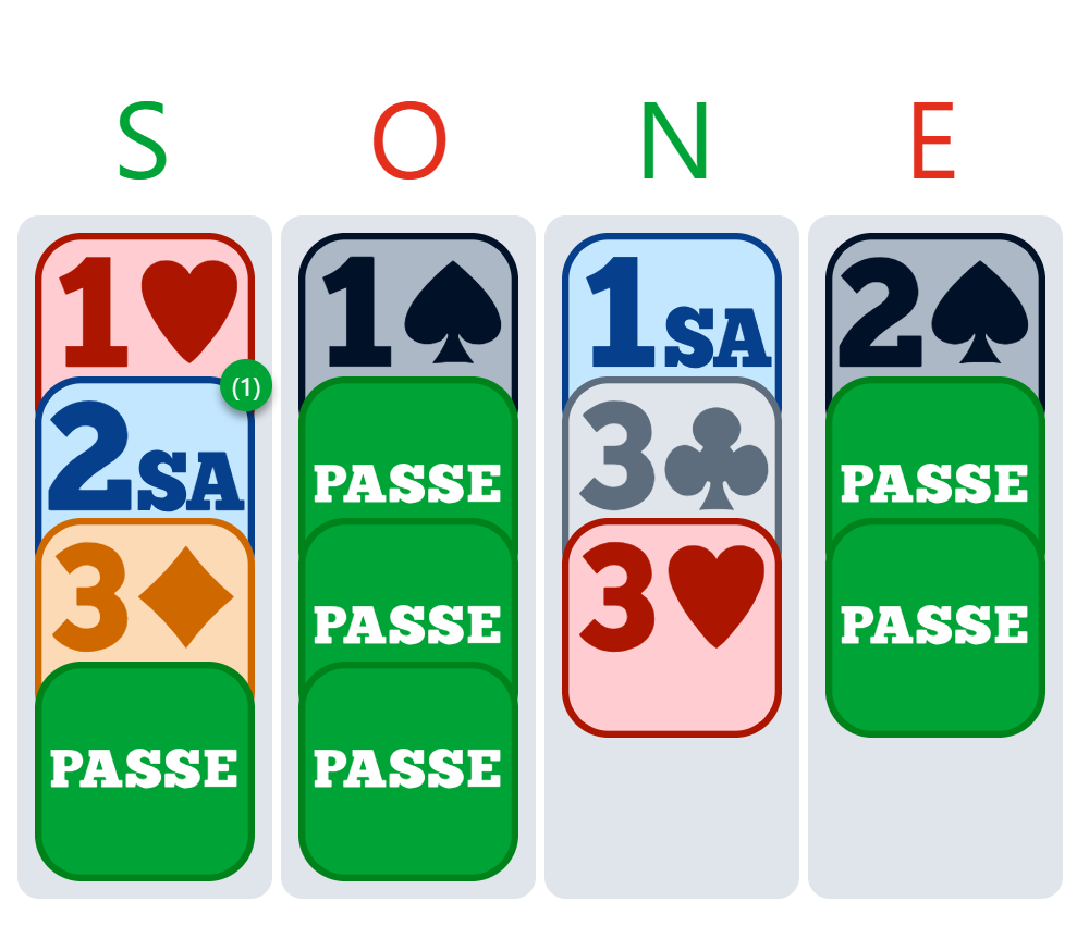 Lors du premier match, j’ai eu droit à un bon exercice de patience en tant que déclarante. Je voulais cacher ma main, j’ai donc enchéri 4♠ directement sans nommer mes Carreaux.