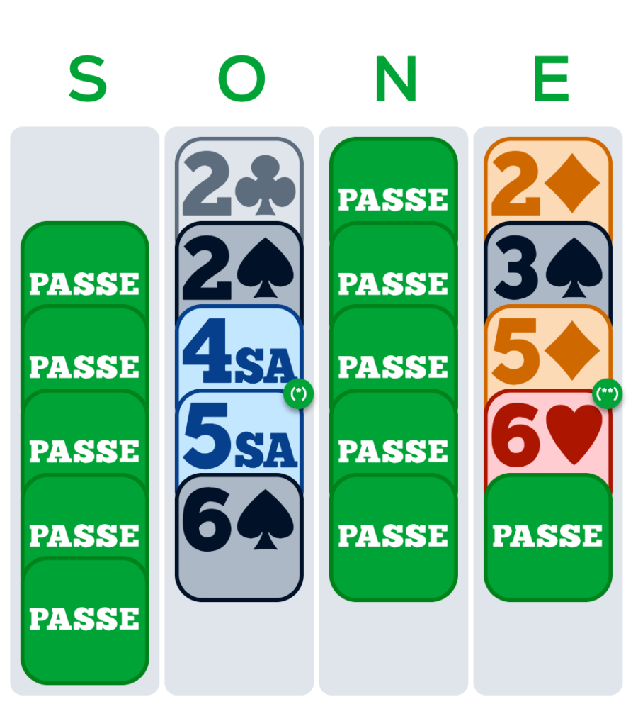 Les enchères se sont déroulées comme indiqué ci-dessus. Madhav (Ouest) annonce 5SA (Demande aux rois) après un Blackwood 41-30. Tirtharaj a répondu 6♥, montrant le Roi de Cœur ou bien ceux de Carreau et de Trèfle. Comme Madhav avait lui-même le Roi de Trèfle, il savait que Tirtharaj n’avait que le Roi de Cœur. Ainsi, avec un Roi manquant et une possible perdante à Cœur, il a stoppé les enchères à 6♠.