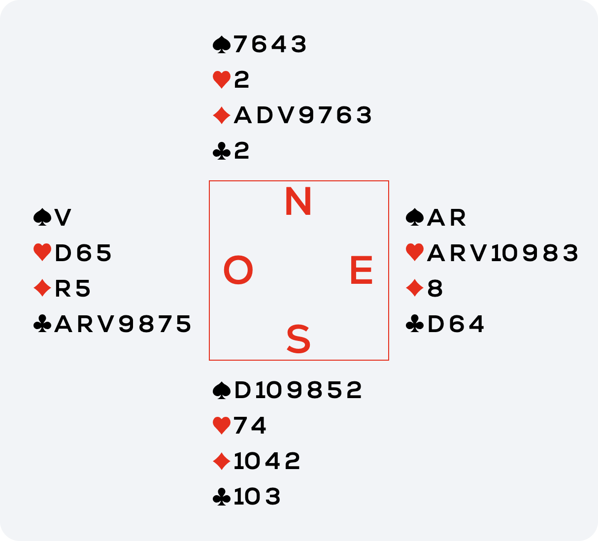 Sud a entamé d’un Carreau, ma partenaire a joué le Roi de sa main et Nord a remporté la première levée de l’As. Il a rejoué un Pique, que ma partenaire a pris de l’As. Elle a immédiatement tiré les atouts et remporté les levées restantes. Les enchères ont été folles, mais ce 6♥X d’Est nous rapporte un 100% sur cette donne !
