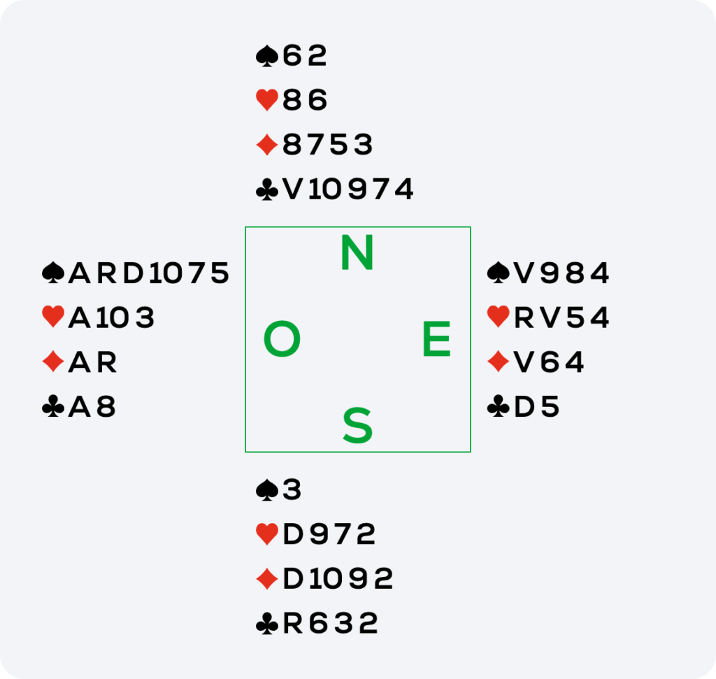 Enfin, pour mettre en main ses adversaires, il a joué le 8 de Trèfle de sa main. Si Nord ne le couvrait pas, le 8 de Trèfle serait la levée supplémentaire. Nord a donc été contraint de le couvrir du 10 de Trèfle. À ce stade, si Nord avait rejoué un Cœur, la position aurait été connue … sinon il fallait dû jouer en coupe et défausse, offrant aussi le contrat. Ainsi, nous avons fait 12 levées sans avoir besoin de la chance.